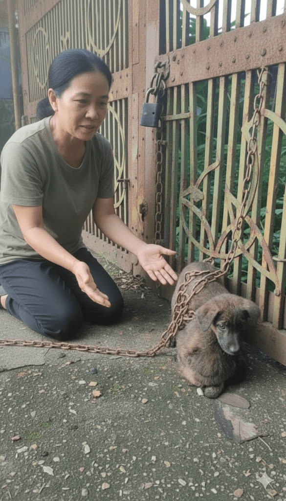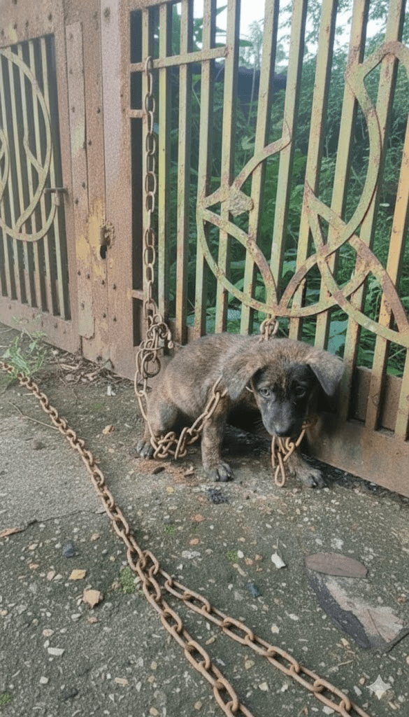 The morning mist still clung to the rusty gates, blurring the edges of a scene that would forever be etched in the memory of those who witnessed it. There, amidst the encroaching weeds and the silence of a forgotten path, sat a tiny, brindle-coated puppy. A heavy, corroded chain, clearly too substantial for its frail form, was wrapped around its neck, tethering it cruelly to the cold, unforgiving metal. Its eyes, dark and glistening with unshed tears, held a depth of sorrow that belied its tender age. Each whimper was a tiny plea, a fragile echo in the vast, indifferent world.