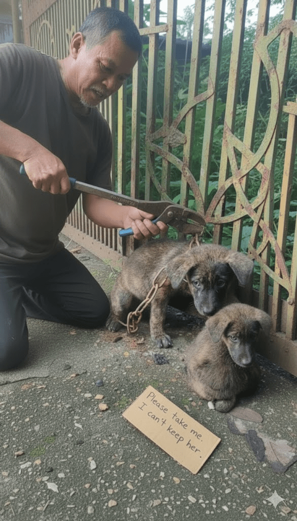 Frantic, Maria rushed to the nearest hardware store, explaining the dire situation to its owner, an gruff but kind-hearted man named Mr. Henderson. He listened intently, his expression softening as he realized the urgency in her voice. Without a moment’s hesitation, he grabbed a set of bolt cutters and insisted on accompanying her back to the gate. The sun was now higher, casting long shadows, and the puppy’s whimpers had grown weaker. Its eyes, however, still held that desperate, unwavering hope. Mr. Henderson, with practiced efficiency, managed to snip through the chain, a sound that resonated with the weight of both freedom and a terrifying revelation. As the last link broke, a small, faded tag fell from the puppy’s neck. It wasn’t a name tag, but a plea: “Please take me. I can’t keep her.”