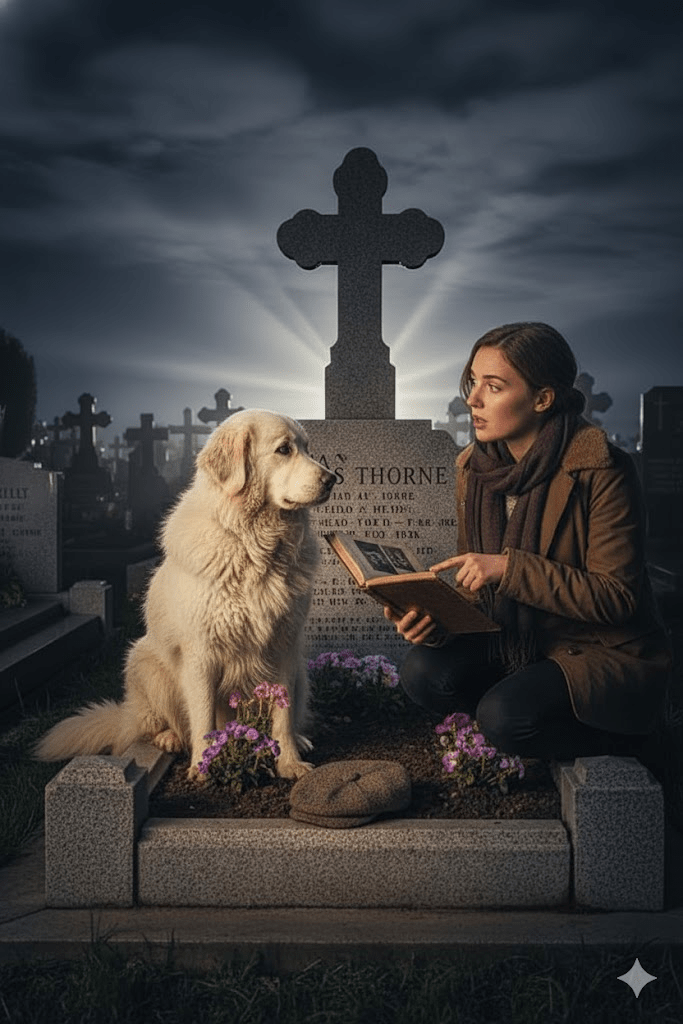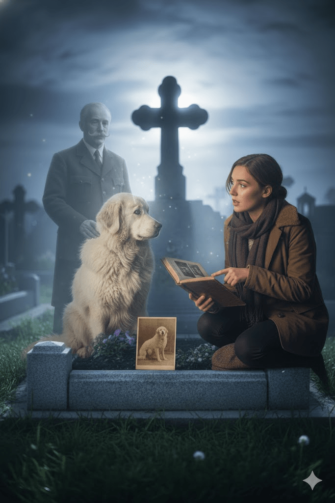 Armed with old photographs and diaries, the historian approached Barnaby. As she sat near the grave, flipping through a worn photo album, Barnaby’s ears perked up. One particular image, a sepia-toned portrait of Elias Thorne with his original white dog, seemed to captivate him. He nudged the book with his nose, then looked up at the historian with an intensity that suggested recognition, a bridge across time. It was as if the past had reached out and touched the present, affirming a connection that defied logic.