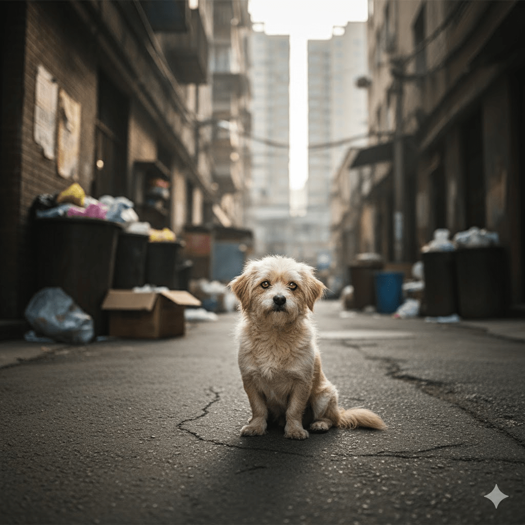 The alley was a symphony of forgotten things – rusted bins, discarded hopes, and the faint, mournful scent of neglect. It was here, amidst the urban decay, that “Tang” made her first appearance. Not with a whimper, nor a bark, but with a gaze that pierced the casual observer. Her eyes, gold and shadowed, held the weary wisdom of a soul far older than her small, matted frame suggested. She was a mere wisp of a dog, a tangled mess of cream-colored fur, with legs that seemed to falter with every tentative step.