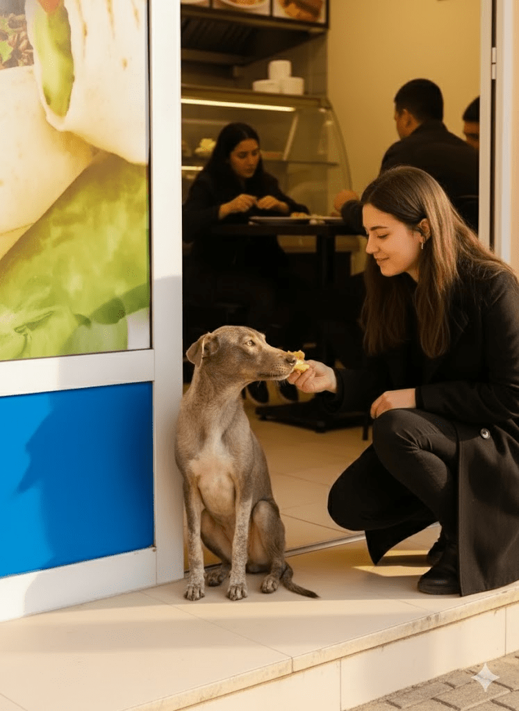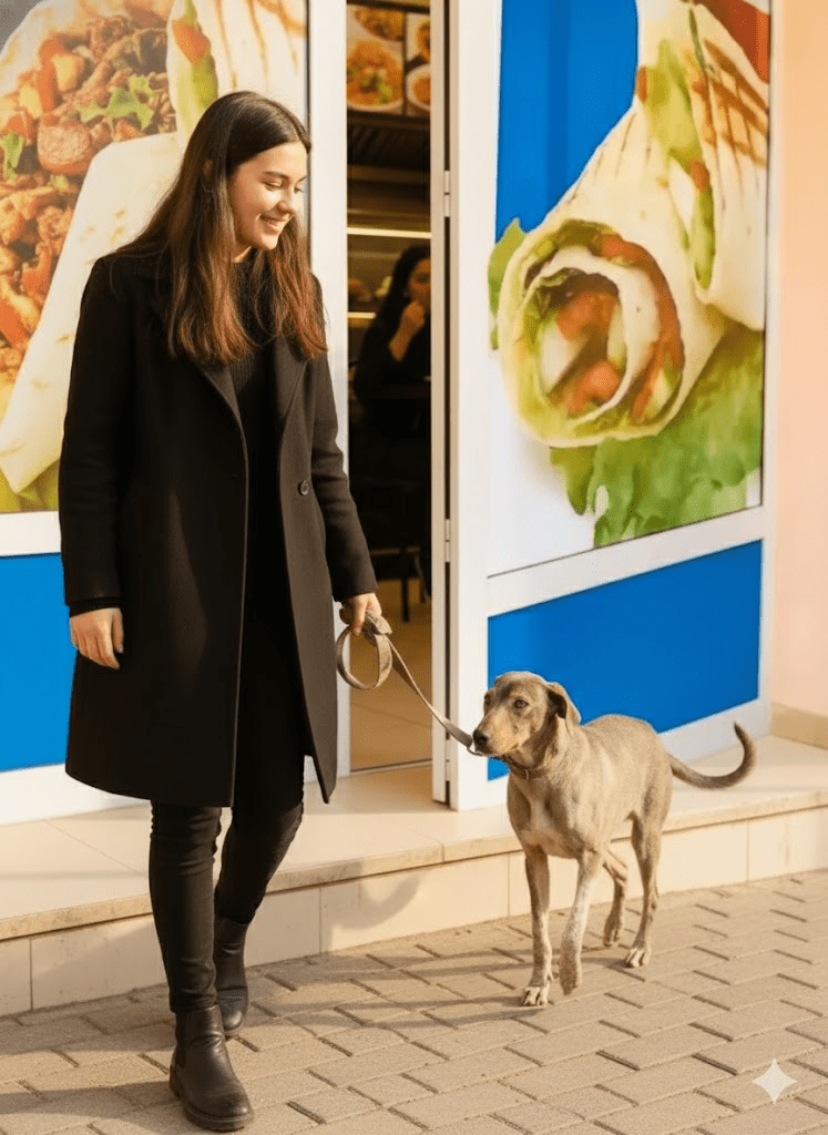 The aroma of freshly grilled meat wafted tantalizingly from the bustling eatery, a scent that for months had been both a torment and a beacon for a scruffy, emaciated stray dog. He called himself “Whisper” in his silent canine thoughts, for he moved through the urban landscape like a shadow, his presence rarely acknowledged. Today, however, was different. Driven by an unbearable hunger pang and an inexplicable pull towards the vibrant poster of a succulent wrap plastered on the restaurant’s door, Whisper had dared to sit, a picture of quiet desperation, just outside the threshold. His ribs protruded starkly, his fur was matted and thin, and his eyes, usually downcast, held a flicker of yearning as he watched patrons enjoying their meals. Unbeknownst to him, this simple act of waiting would be the catalyst for a series of events that would not only transform his life but also ripple through the lives of many others in unexpected ways.