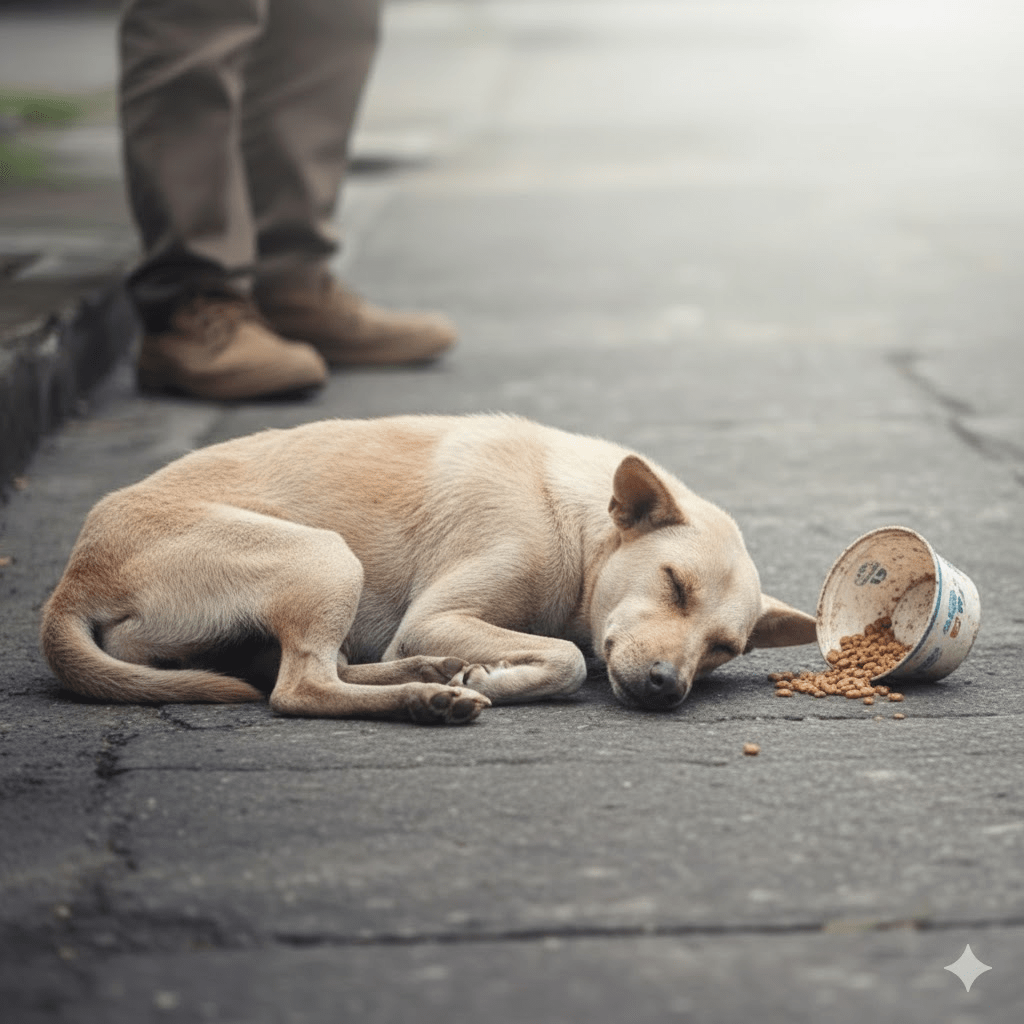 The rain had just begun to subside, leaving the streets slick and reflecting the gray, indifferent sky. It was on such a melancholic afternoon that a heartbreaking sight emerged from the urban shadows – a forlorn dog, its emaciated frame hunched by a curb, a single tear seemingly suspended in its sad eye.