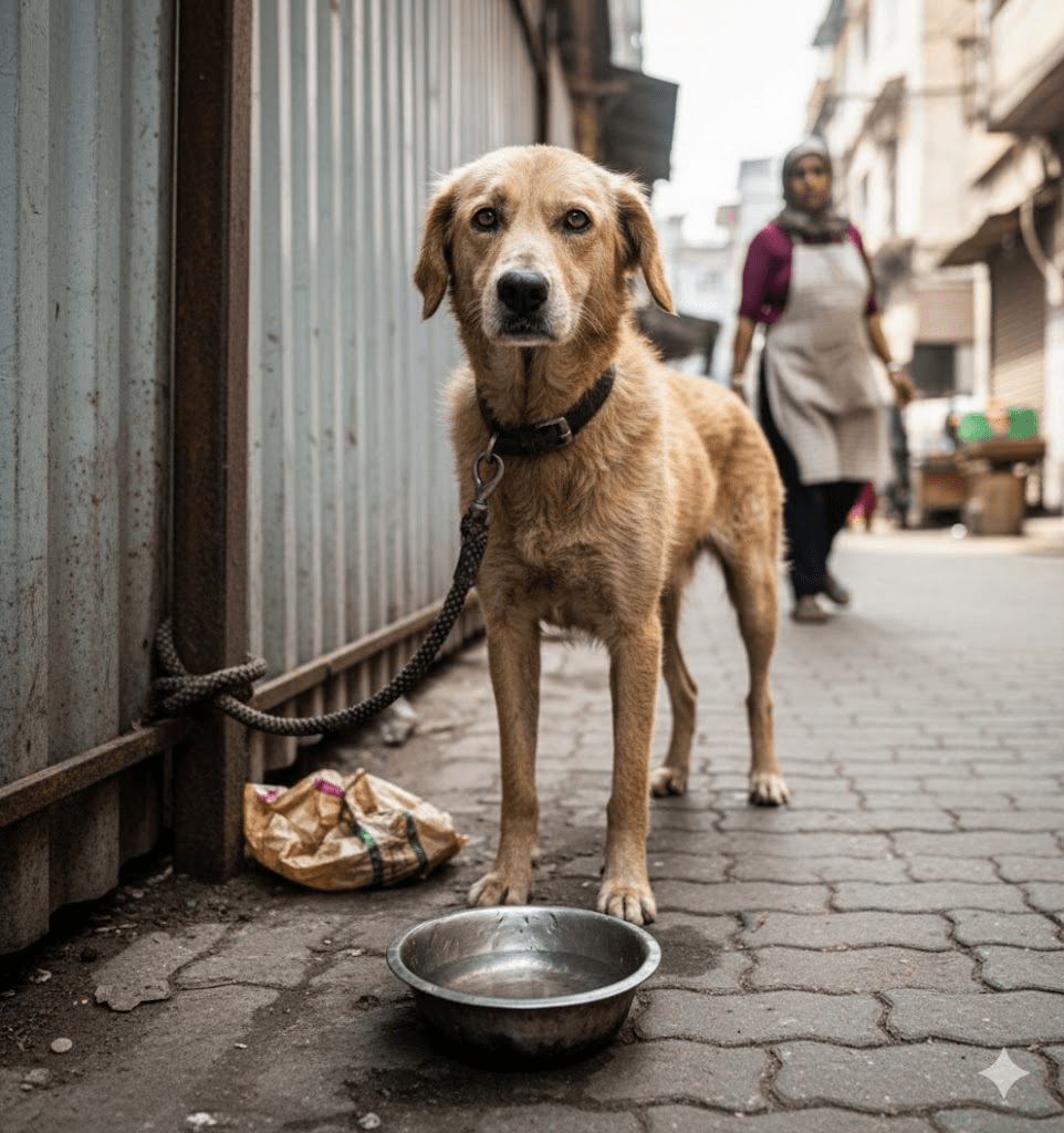 The first twist in Rex’s tale began not with a kind hand, but with a harsh one. He was discovered by a local street vendor, not out of compassion, but annoyance. Rex’s presence near her stall was deemed a nuisance, a threat to her meager daily earnings. Instead of chasing him away with stones, as was common, she decided on a different tactic: she tied him to a rusted fence, leaving him with a bowl of stale water and a grim warning in her eyes. It was a crude act, yet it inadvertently saved him from a more dangerous fate on the busy streets. His cautious eyes, carrying the weight of betrayal from a past unknown, watched her depart, a silent plea in their depths.