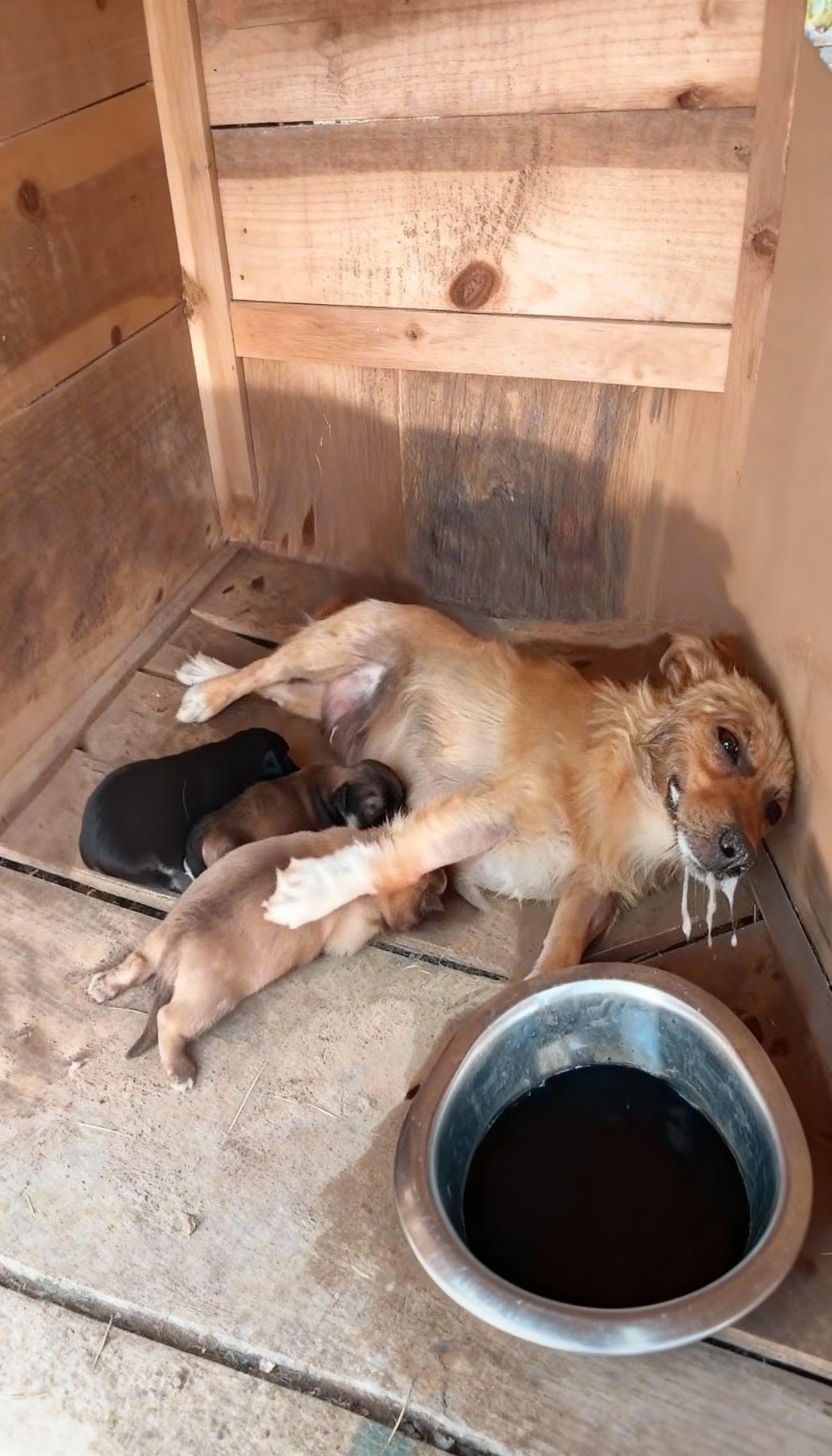 In a small wooden shed on the outskirts of a quiet village, a tired but devoted mother dog lay with her newborn puppies. It was a warm afternoon on October 25, 2025, when she gave birth to her little ones, nestled against the rough wooden walls. Exhausted from labor, she rested her head against the corner, her fur damp with sweat, yet her eyes shone with a gentle determination.