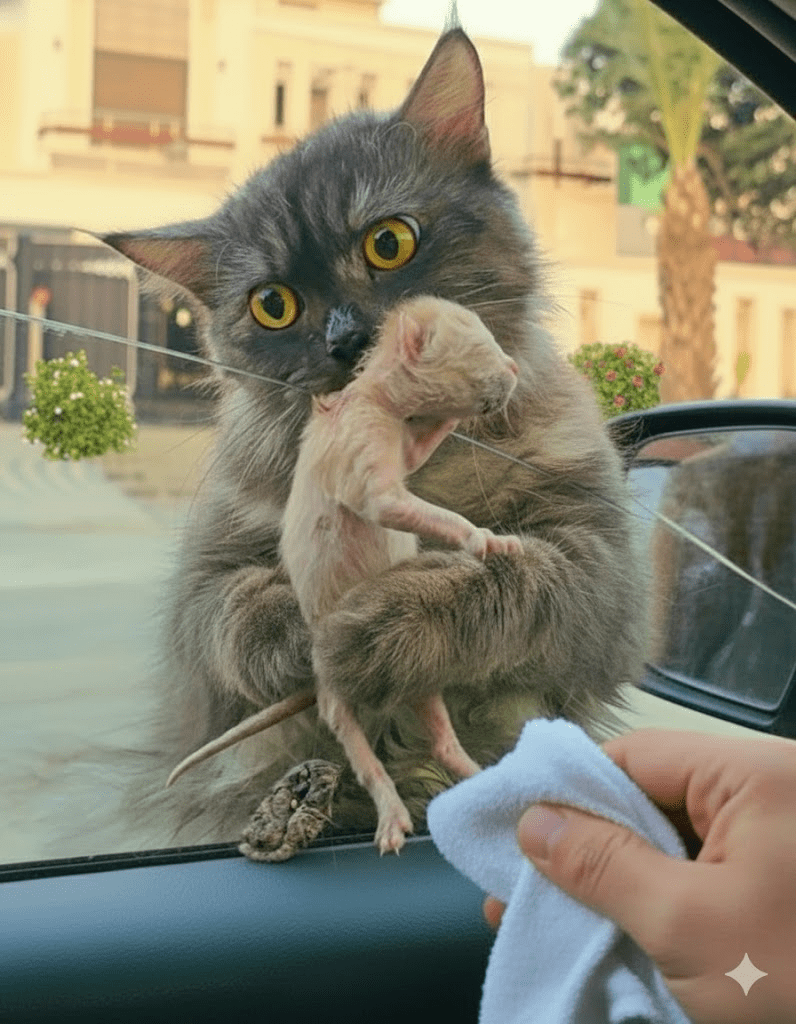 The scorching midday sun beat down on the cracked pavement, reflecting blindingly off the dusty windows of parked cars. Inside one such vehicle, a family was preparing to leave, oblivious to the drama unfolding just beyond their glass barrier. Suddenly, a pair of enormous, pleading yellow eyes appeared, pressed against the window. It was a cat, a scruffy, matted creature with fur the color of storm clouds, holding something delicate and pink in its mouth. The object wriggled weakly, and with a jolt, the onlookers realized it was a newborn creature, too small, too vulnerable, and unmistakably, not a kitten. This was the moment a desperate mother, against all odds and instincts, sought help for an orphan she had clearly adopted as her own. The scene was bizarre, heartbreaking, and utterly captivating, a testament to the inexplicable bonds that can form in the most unexpected circumstances.