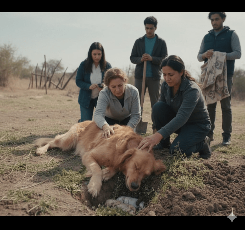 The sun beat down relentlessly on the parched earth, casting long, distorted shadows as a small group gathered around a freshly dug grave. It wasn’t a human burial, but the solemnity of the occasion was no less profound. At the center of this heartbreaking scene was Goldie, a beautiful Golden Retriever, her usually bright eyes now clouded with an unbearable sorrow.
