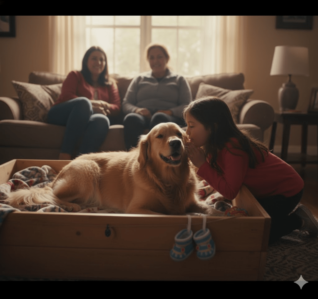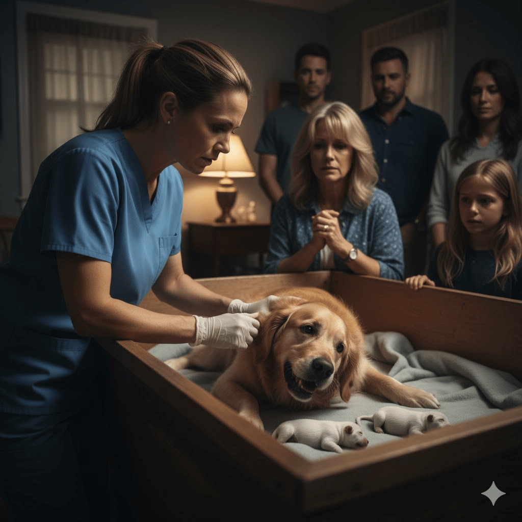 In the quiet aftermath, Goldie’s grief was almost unbearable to witness. She refused to leave the whelping box, nudging her lifeless pups, emitting soft, mournful whimpers that echoed through the otherwise silent house. Lily, usually so boisterous, sat quietly beside her, tears silently streaming down her face as she stroked Goldie’s fur. The veterinarian suggested removing the pups, gently explaining that Goldie’s prolonged contact with them could lead to further distress. But Goldie would not allow it, growling softly whenever anyone approached, her maternal instinct fiercely protective even in the face of death.