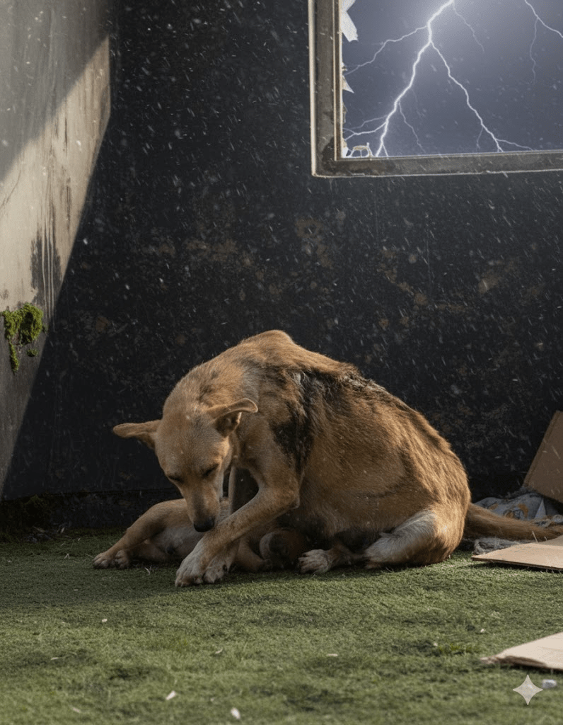Days turned into weeks, and Luna’s vigilance never wavered. She foraged tirelessly, often returning with scraps of food she’d painstakingly unearthed, always prioritizing her pup’s nourishment over her own. The harsh realities of their existence, however, began to take their toll. One particularly cold night, a fierce storm swept through, tearing at the flimsy shelter they’d fashioned. Luna, despite her weakening state, huddled protectively over her pup, shielding it from the biting wind and lashing rain.