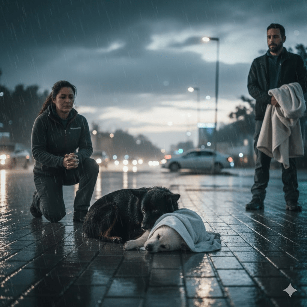 The torrential rain lashed down, blurring the city lights into streaks of defiant color against the oppressive gloom of the night. On a deserted sidewalk, amidst the relentless downpour, a scene unfolded that would stir the hearts of all who witnessed it. A loyal black dog, its fur matted and glistening with rain, stood a steadfast vigil over a smaller, injured white puppy. The smaller dog lay motionless, a stark, heartbreaking contrast to the vibrant life that still flickered within its devoted guardian. The black dog’s eyes, filled with a primal grief and unwavering loyalty, never left its friend’s still form. It whimpered softly, nudging the puppy with its wet snout, a silent plea against the inevitability that hung heavy in the air.