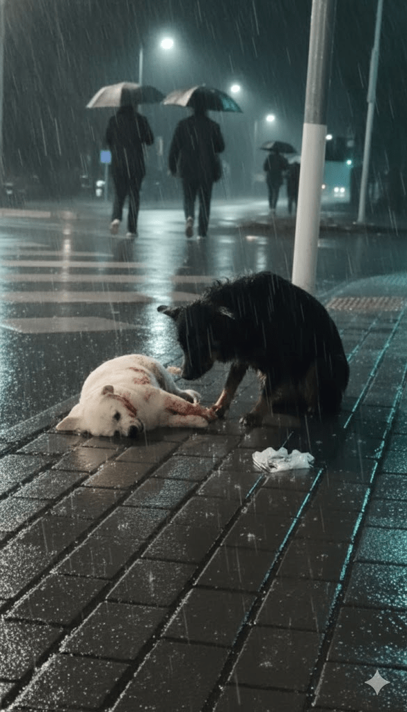 The relentless downpour mirrored the turmoil in the heart of a scruffy black dog, whose name, we would later learn, was Shadow. He sat huddled on the cold, wet pavement, his dark eyes fixed on the small, pale form beside him. A tiny white puppy, barely more than a bundle of fur, lay motionless, its delicate body a stark contrast to the harsh urban environment. Blood, diluted by the sheeting rain, stained the puppy’s fur, a testament to an unseen trauma. The night was a symphony of howling wind and pounding rain, a cruel backdrop to the silent vigil Shadow kept. He whimpered softly, a mournful sound lost in the storm’s fury, nudging the puppy with his nose, as if willing it to stir, to offer some sign of life.