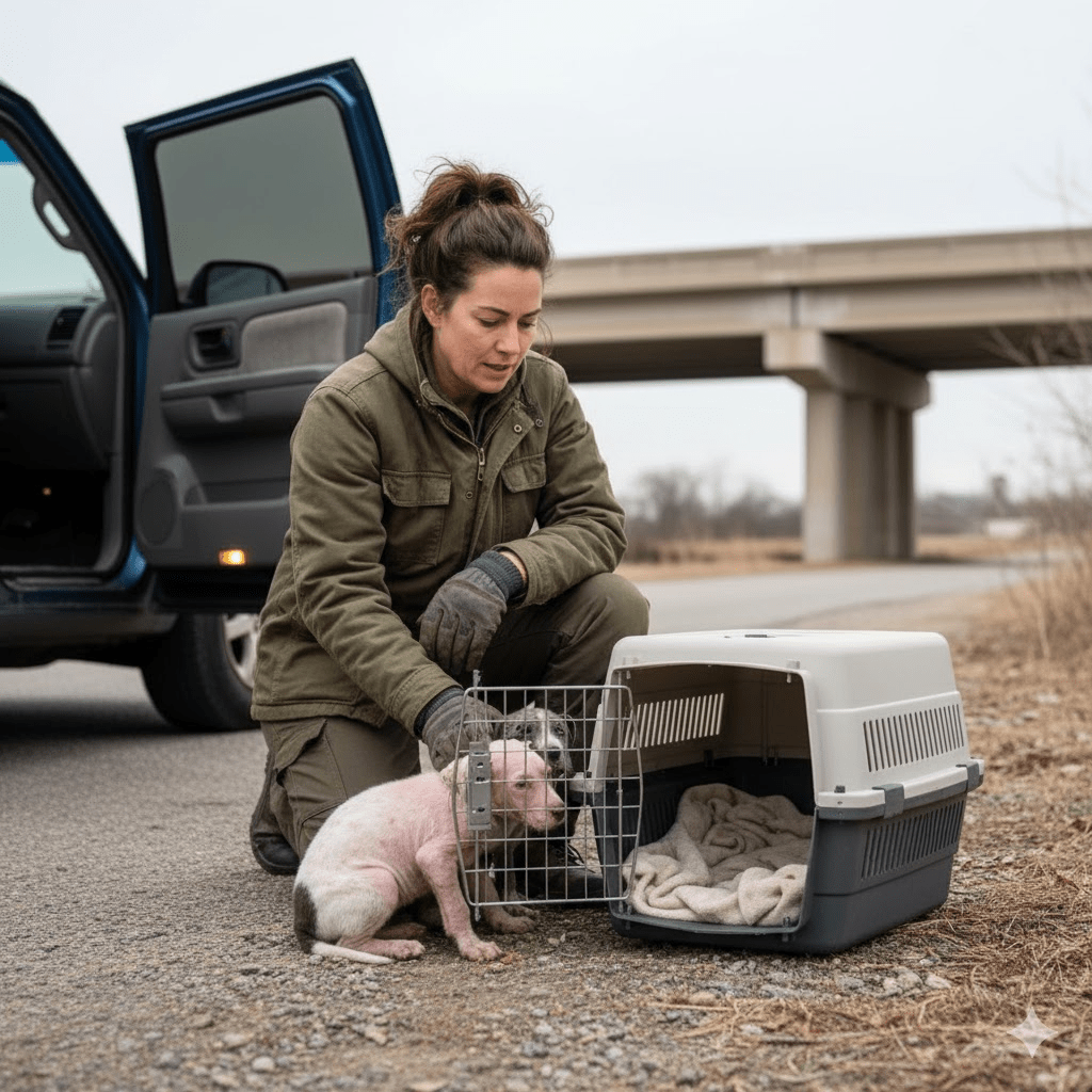 The late autumn air was sharp and unforgiving, stripping the trees bare and biting at anything exposed. For three tiny souls, no older than ten weeks, the chill was a constant, agonizing torment. Huddled together on a desolate rockpile, nestled precariously between a forgotten highway overpass and a dense thicket of scrub, they were a picture of profound despair. Two of them, mottled grey and white, bore the unmistakable signs of severe mange, their coats patchy and inflamed. The third, a smaller, mostly pink and white puppy, was almost entirely hairless, its delicate skin a raw, weeping testament to neglect and disease. All three shivered uncontrollably, their ribs starkly visible beneath their stretched skin, and their eyes, though wide with fear, held a desperate plea. They had been abandoned, left to face the encroaching winter with nothing but each other’s frail warmth and the fading hope of survival. This was the scene that greeted a passing motorist, Sarah Jensen, on a Tuesday morning, a sight so heartbreaking it brought her car to an immediate, screeching halt. She knew, with a certainty that chilled her to the bone, that without immediate intervention, these puppies wouldn’t last another day.