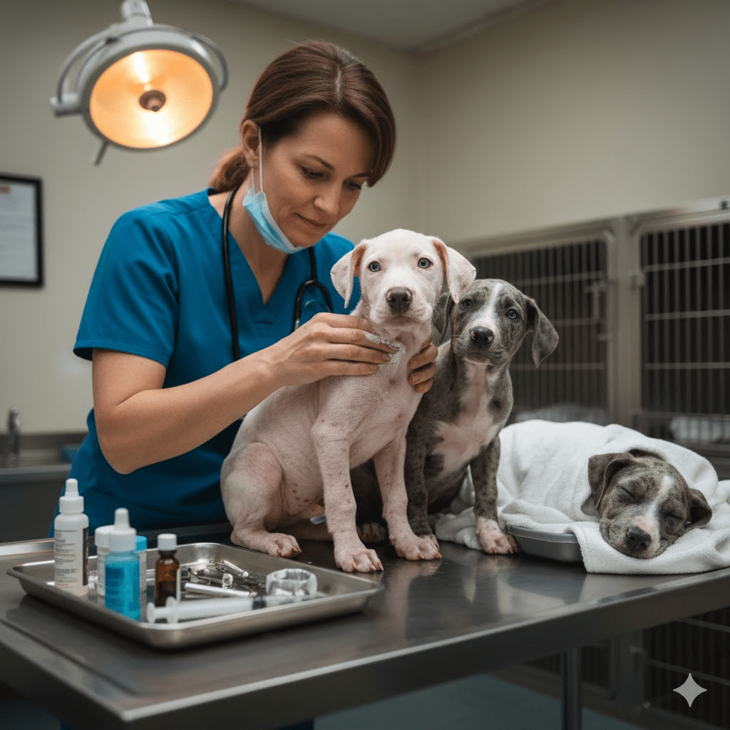 Upon arrival at the sanctuary, the true extent of their suffering became chillingly clear. Dr. Evelyn Reed, the sanctuary’s lead veterinarian, performed an immediate examination. Rosie, the hairless pup, was not only battling severe demodectic mange but also a nasty secondary bacterial infection covering nearly her entire body, causing her skin to weep and bleed in places. Dusty and Smokey, while not as critically afflicted, were severely underweight, dehydrated, and infested with parasites. “They’re lucky to be alive,” Dr. Reed stated grimly, her voice laced with concern. “Another day out there and we might have lost them. Their immune systems are completely compromised.”
