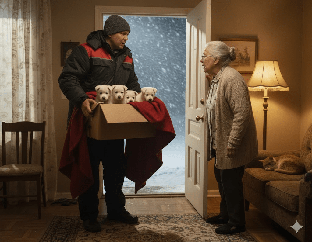 With the pups nestled safely in a warm box inside his truck, the delivery driver, a gruff but kind-hearted man named Sergei, faced another dilemma. His route was long, and he couldn’t take them to a shelter immediately. Remembering his elderly neighbor, a retired veterinarian known for her love of animals, Sergei made another unplanned detour. He arrived at her doorstep, a motley crew of shivering puppies in tow, a sight that brought a look of bewildered concern to the old woman’s face.