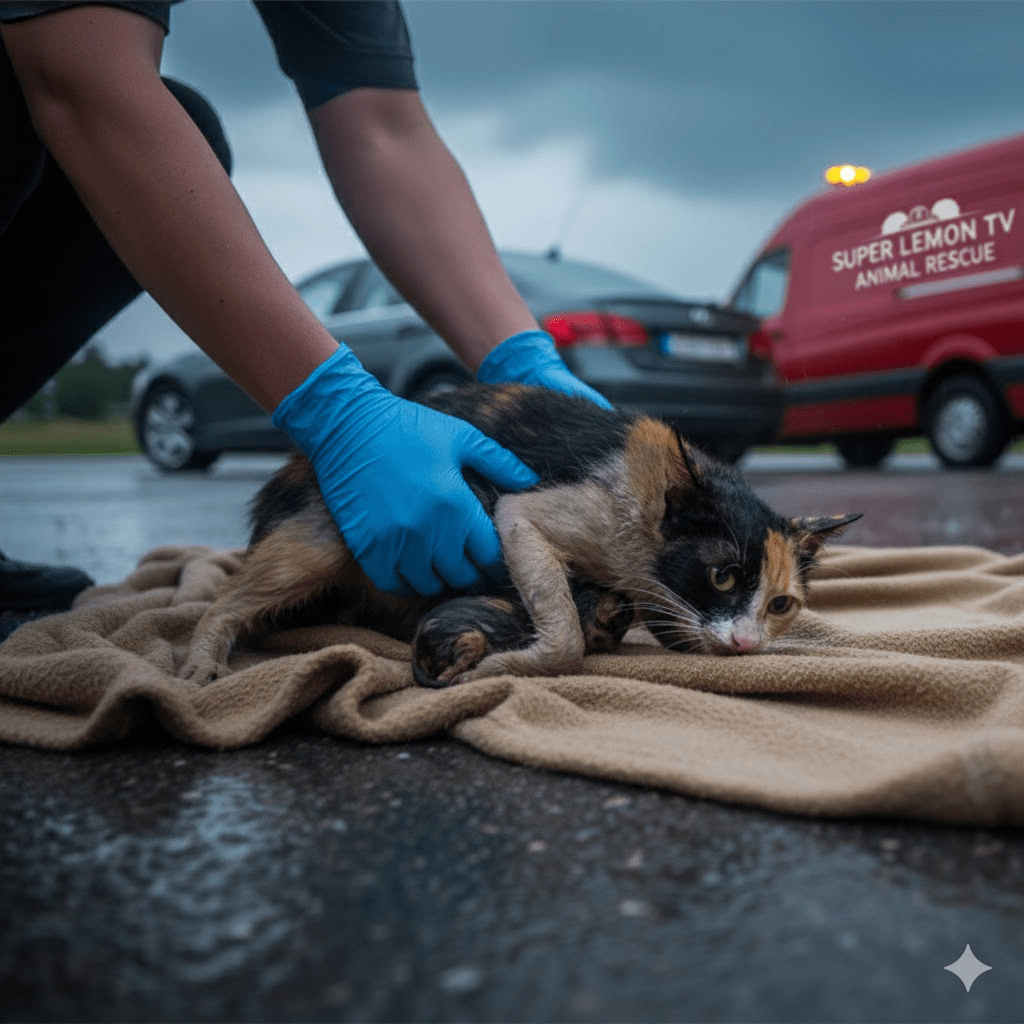 The incessant rain had turned the familiar streets of what was once a bustling town into a treacherous, murky expanse. Homes were submerged, livelihoods threatened, and the air hung heavy with a mix of despair and the metallic tang of floodwaters. Amidst this watery chaos, a small, calico form lay utterly still on the slick, cold asphalt, her fur matted and dark with rain. She was a mother cat, her eyes wide with a desperate, primal fear, barely clinging to life. Scattered around her were her tiny, newborn kittens, frail and shivering, their cries almost swallowed by the relentless downpour. Their condition was critical, their chances slim. This was the scene that greeted a local rescue team, their hearts sinking at the sight. What began as a routine animal rescue in the face of a natural disaster, however, was about to unfold into a saga far more profound and unexpected than anyone could have imagined.