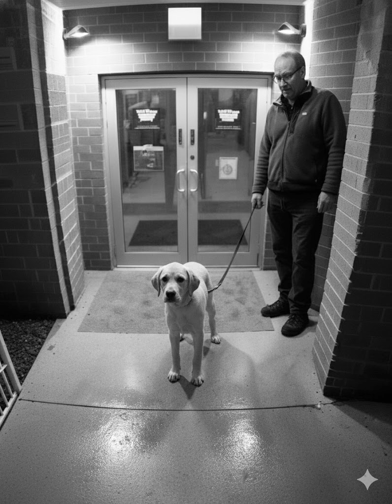 As John approached the brightly lit entrance of the animal shelter, the puppy, which had been quiet and still in his arms, began to squirm. It let out a series of insistent yips, struggling to get down. Puzzled, John gently set the pup on the ground, expecting it to be eager to go inside. Instead, the small Labrador took a few steps towards the doors, then turned, looking back at John with an intensity that surprised him, as if urging him to follow.