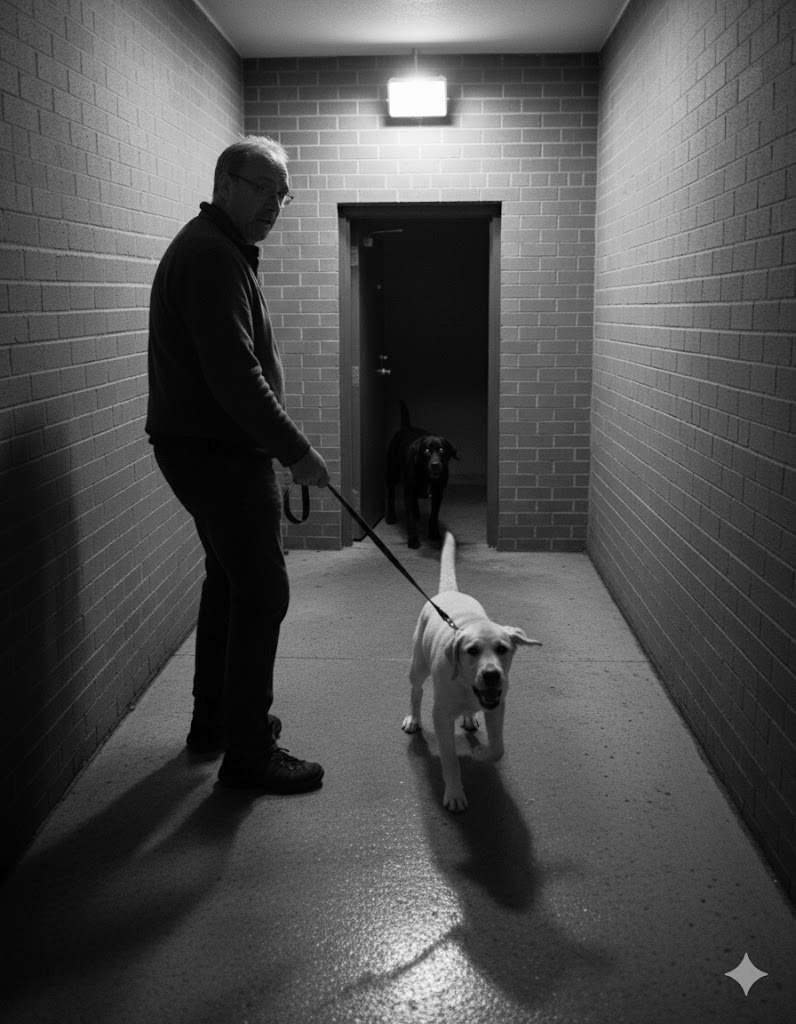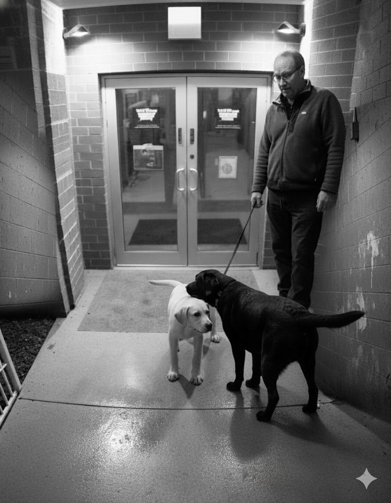 At the service entrance, a shadow stirred in the dimly lit doorway. To John’s astonishment, a larger, older black Labrador emerged, its tail wagging tentatively. It was clear this was not another stray; this dog had a collar and a tag. The puppy, upon seeing the older dog, rushed forward, nuzzling against it with evident joy. It was a reunion, and the older Labrador was clearly the puppy’s mother.