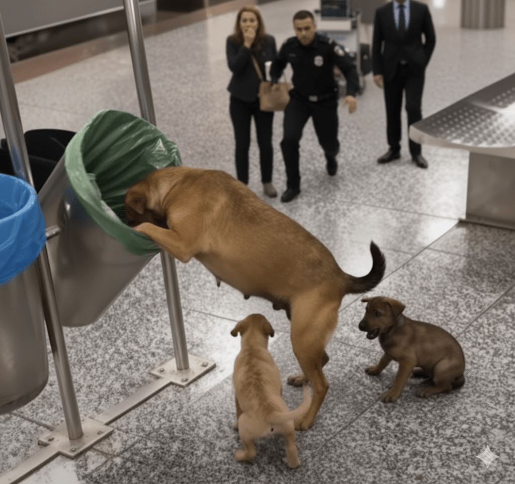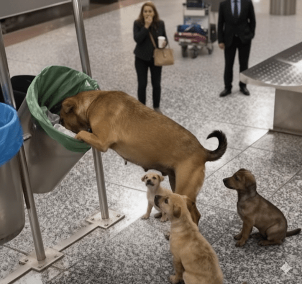 Suddenly, a sharp clang echoed through the terminal as the dog lost her footing, the bin tilting precariously. A collective gasp rose from the small crowd that had now gathered. The pups yelped, scattering slightly, their faces etched with momentary fear. For a heart-stopping second, it seemed the bin would topple, potentially injuring the determined mother or spilling its refuse across the pristine floor. A security guard, alerted by the commotion, began to approach, his expression stern.