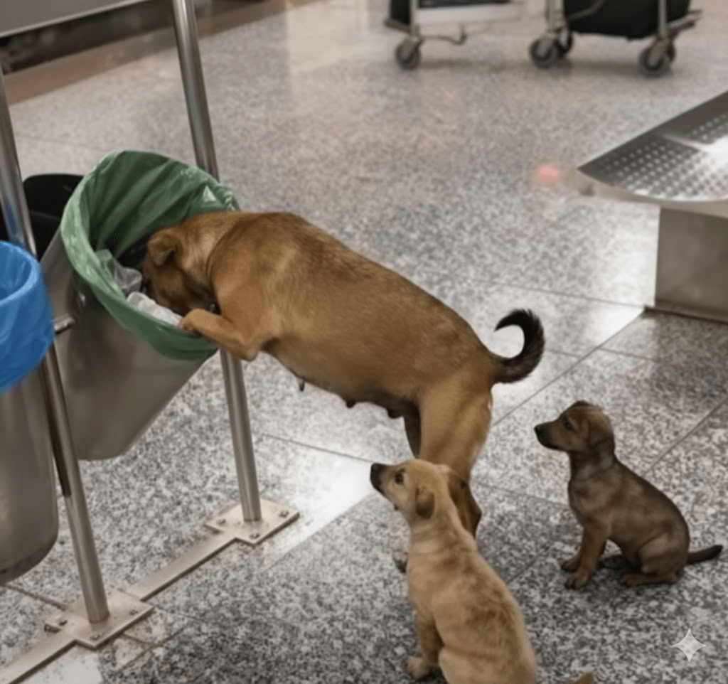 The bustling terminal hummed with the usual cacophony of hurried footsteps, loudspeaker announcements, and the distant rumble of arriving trains. Most commuters, lost in their own worlds, barely registered the periphery. But on a quiet Tuesday morning, an extraordinary scene unfolded near a row of gleaming waste bins, a poignant ballet of desperation and maternal love that would forever etch itself into the memories of a select few onlookers. It began subtly, with a medium-sized, unassuming brown dog, her ribs faintly visible beneath a coat matted with street dust, cautiously approaching a stainless steel bin. Her eyes, usually wary, held a flicker of intense focus, a silent determination that belied her gentle demeanor. Behind her, two tiny pups, mere bundles of fur and innocent curiosity, sat patiently, their small heads cocked, observing their mother’s every move. This wasn’t a casual foraging; this was a mission, a testament to a bond that transcends the harsh realities of the streets.