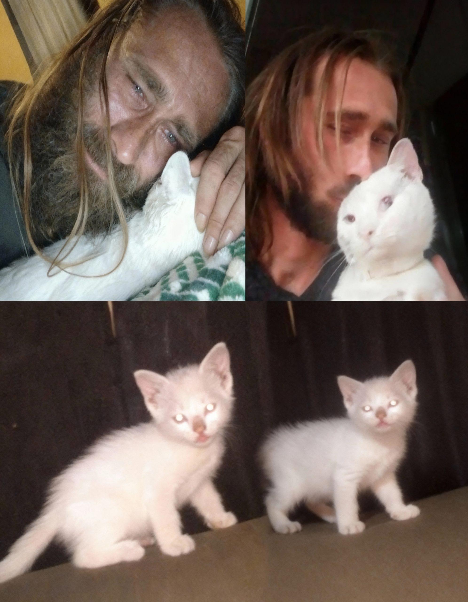 In the dim, rain-slicked alley behind a bustling urban strip mall on a forgotten autumn evening in 2018, where the air hung heavy with the scent of discarded takeout and wet cardboard, a young man named Elias wandered aimlessly after a grueling shift at his warehouse job. Elias, a lanky figure with wild, sun-bleached hair and a beard that spoke of days untamed by routine, had no intention of becoming a savior that night. He was simply cutting through the shadows to shave minutes off his commute home to a cramped apartment that echoed with solitude. But fate, that capricious architect of lives, had other plans. As he sidestepped a cluster of overflowing dumpsters, a faint, unnatural rustle pierced the downpour—not the skitter of rats or the flutter of trash bags, but something softer, more desperate. Peering into the abyss of one rusted bin, illuminated only by the erratic flicker of a distant streetlamp, Elias’s eyes locked onto a tiny, shivering form: a kitten, no larger than his palm, drenched and motionless amid the refuse. Its fur, a ghostly white that seemed to glow against the grime, was matted with filth, and its eyes—milky and unfocused—stared blankly into the void. This was no ordinary stray; this was Casper, a fragile wisp of life on the brink, abandoned to the merciless cycle of the streets, and in that improbable moment, the thread of an extraordinary bond began to weave itself into the fabric of Elias’s existence, pulling him into a saga of resilience, revelation, and raw, unspoken love that would redefine what it meant to be family.