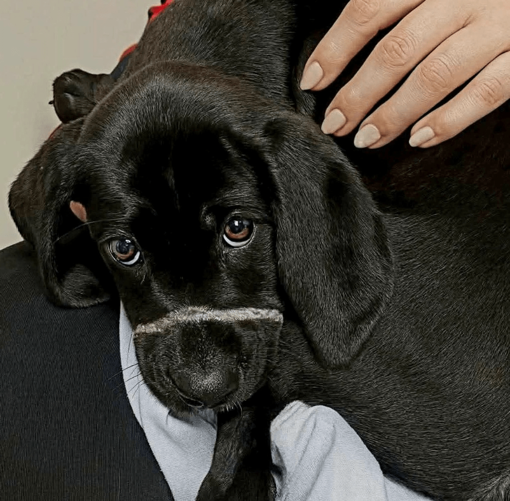 The image of Noddy, a small black Labrador puppy with soulful eyes and a visible muzzle scar, clutches at the…