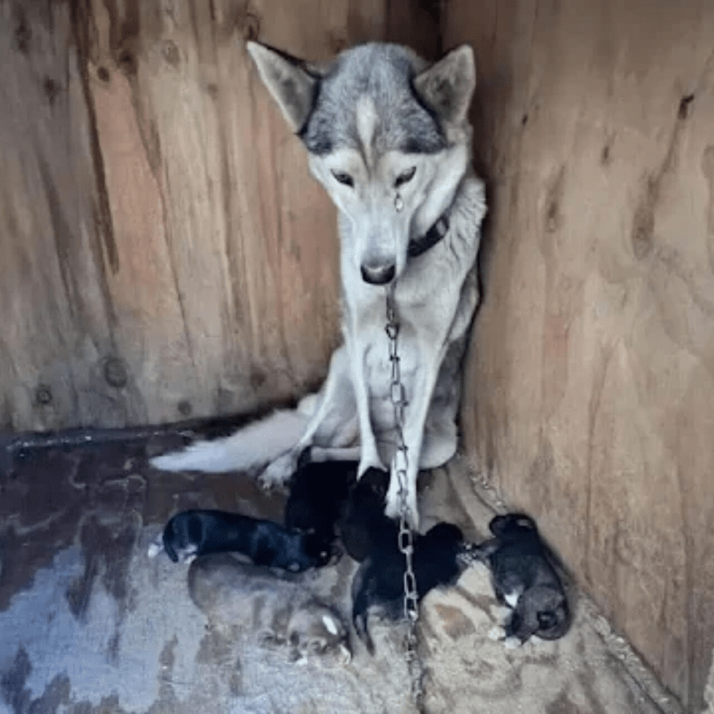 The image of Luna, a Siberian Husky mix, chained in a dilapidated wooden crate, her head bowed in despair as…