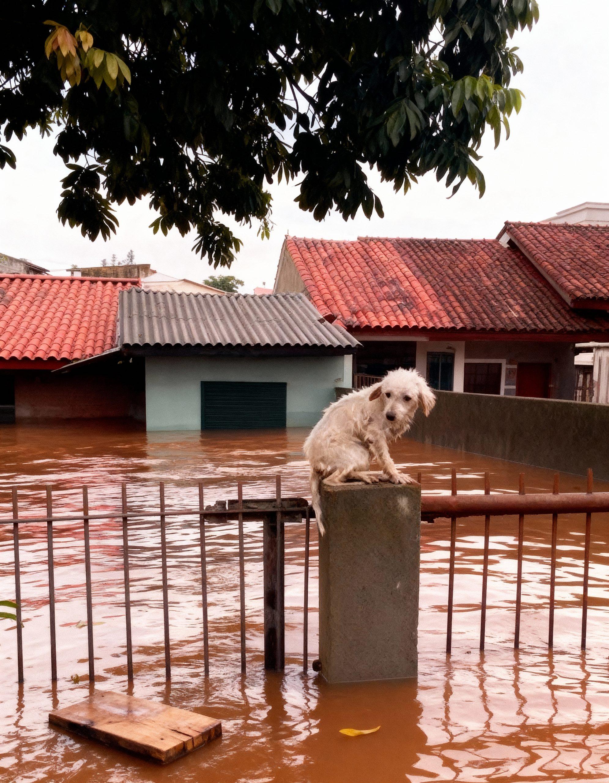 The image of a lone, waterlogged dog perched precariously on a fence post, its fur matted and eyes wide with…