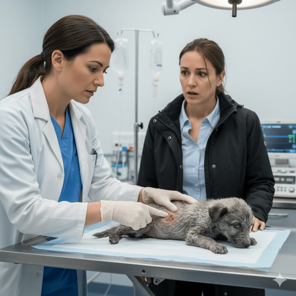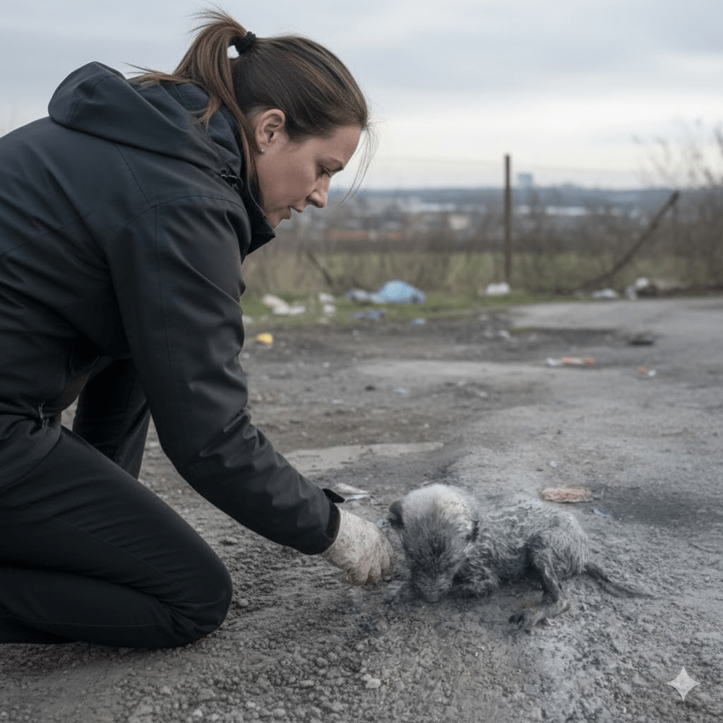 The small, matted creature lay still amidst the desolation, barely distinguishable from the earth that clung to its emaciated frame.…