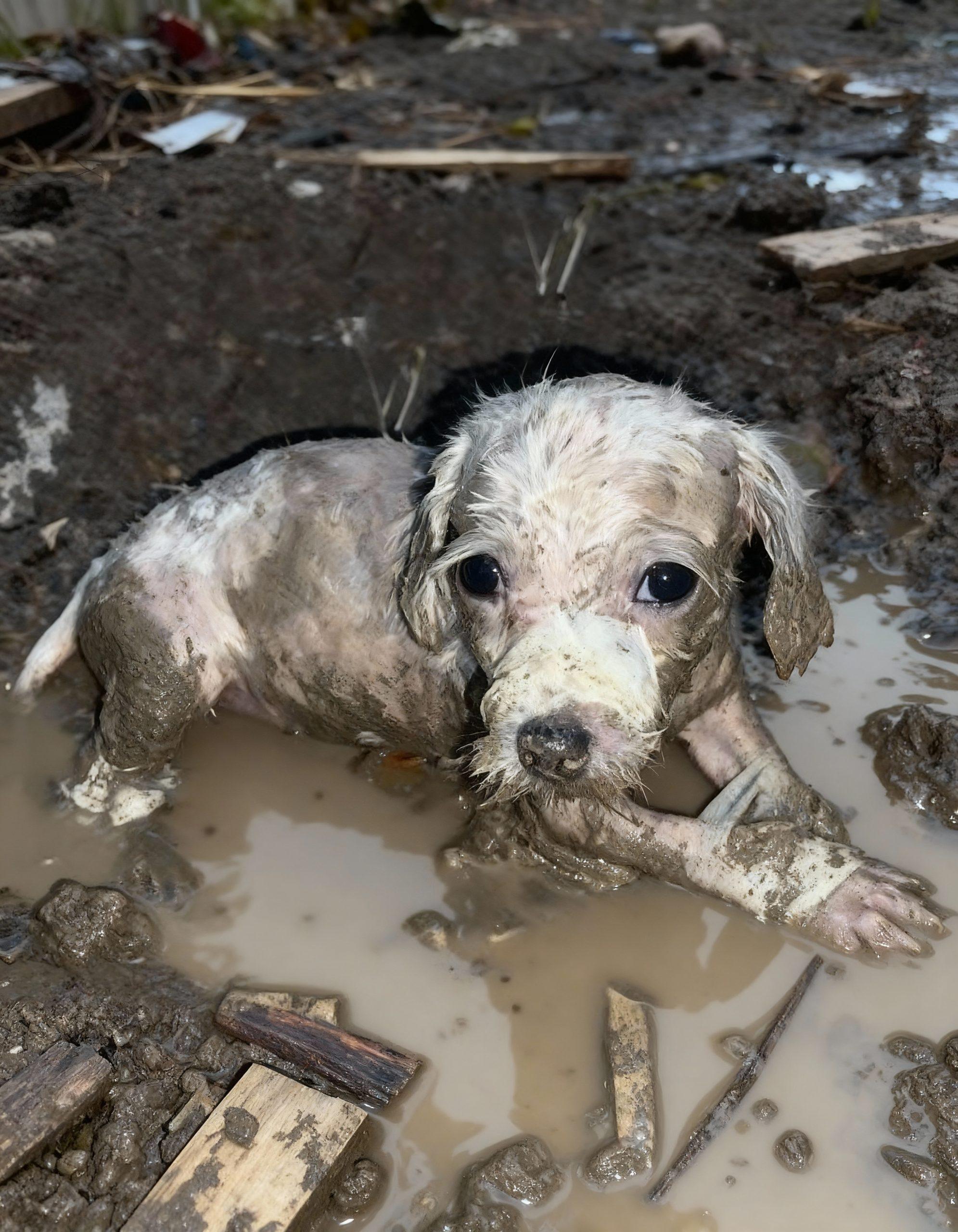 The image before you captures a moment of heartbreaking vulnerability: a small, white-furred puppy, caked in mud, its wide, dark…
