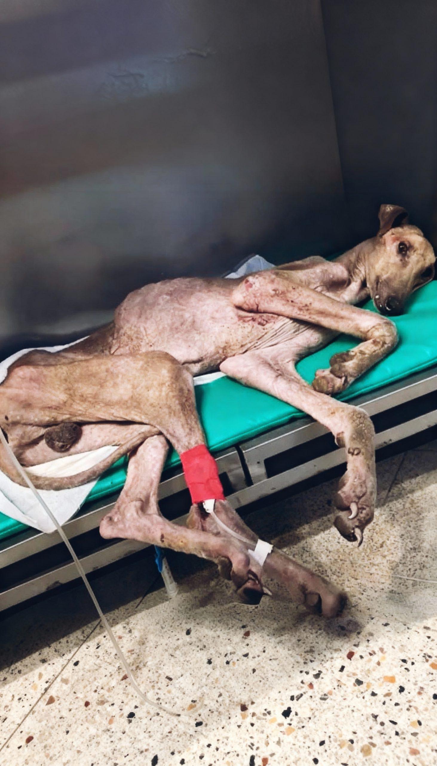 The image before you captures a moment of profound vulnerability—a dog, emaciated and frail, lying on a cold veterinary table.…