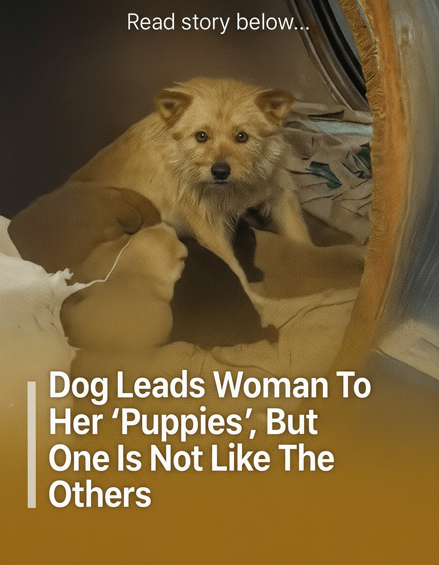 It was a gray, drizzly morning in the outskirts of town when Emma Cole noticed a small, scruffy dog darting across the roadside ditch. The little animal’s golden fur was soaked, her ribs faintly visible beneath the tangled coat. What caught Emma’s attention wasn’t just the dog’s desperate, cautious movements — it was the way she kept turning back, as if urging Emma to follow. The woman, an animal rescue volunteer, had seen this look before: the look of a mother in need. She pulled her car to the shoulder, stepped out into the mist, and softly called, “Hey there, sweet girl…”