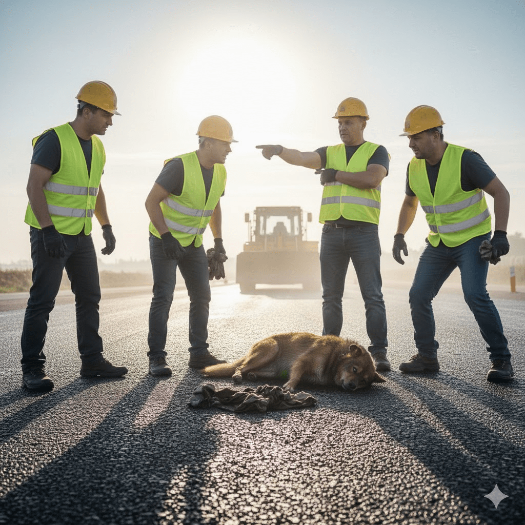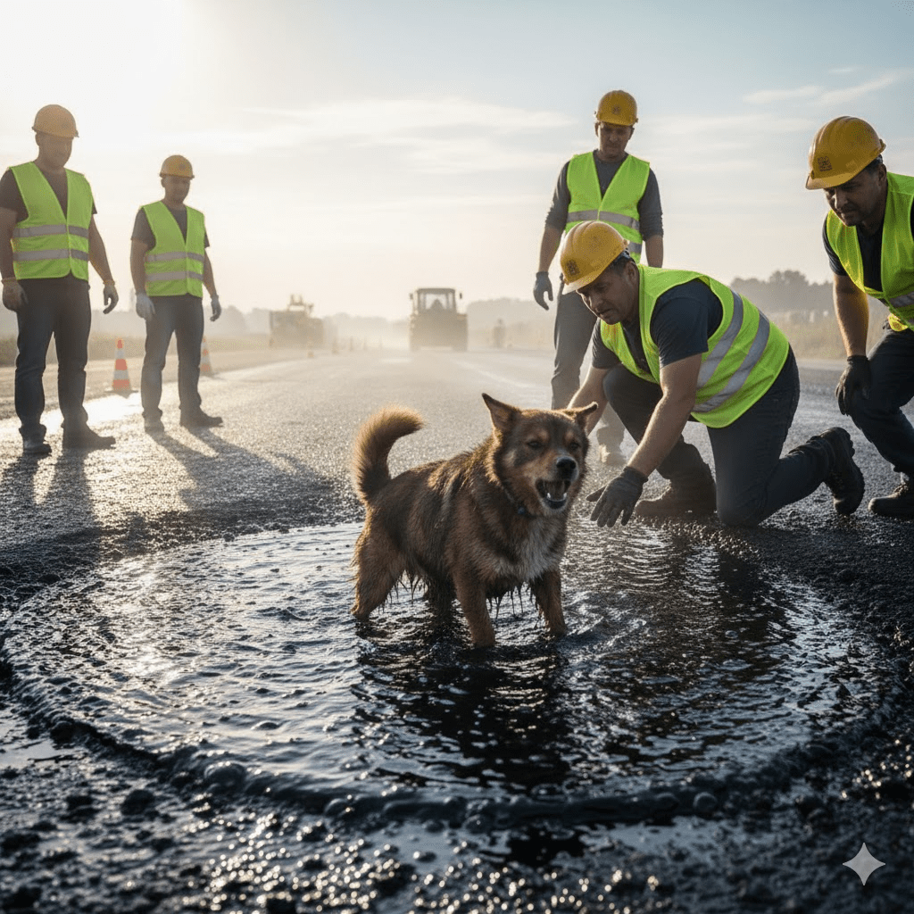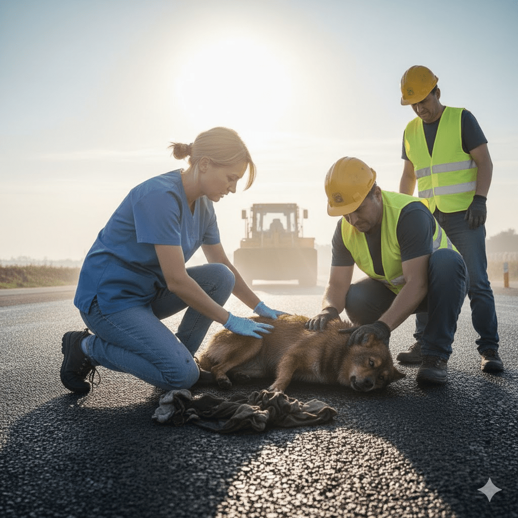 Just as they thought they were making progress, a fresh twist emerged. The chief foreman, initially observing from a distance, grew concerned that their makeshift efforts might cause more harm than good or, worse, disrupt the newly laid asphalt. He called for a temporary halt, insisting they contact professional animal rescue services. This decision, though well-intentioned, sparked a brief but intense debate among the crew. Some argued that every minute counted and waiting for external help could be fatal for Farcik. Others, understanding the foreman’s liability concerns, reluctantly agreed. It was a tense standoff, with Farcik’s life hanging in the balance, a poignant reminder of how often bureaucracy can clash with immediate humanitarian instincts.
