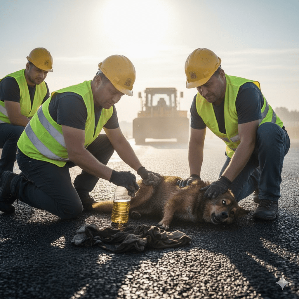 What began as a routine day for the road crew quickly transformed into an impromptu rescue mission. With no specialized equipment on hand for such a predicament, the workers had to think on their feet, improvising with whatever tools and materials they could find. One worker, Janek, a seasoned veteran of countless road projects, recalled a similar incident years ago involving a bird caught in industrial glue. He remembered the importance of acting quickly but carefully, to avoid further injury to the distressed animal. They gathered old rags, some vegetable oil from a lunchbox – anything that might help dissolve the thick, clinging tar without harming Farcik’s skin. The dog, exhausted and terrified, offered little resistance as they began their delicate work, his eyes wide with a mix of pain and a faint glimmer of hope. The scene was chaotic yet focused, a flurry of hurried whispers and gentle movements, all centered on the small, struggling creature.