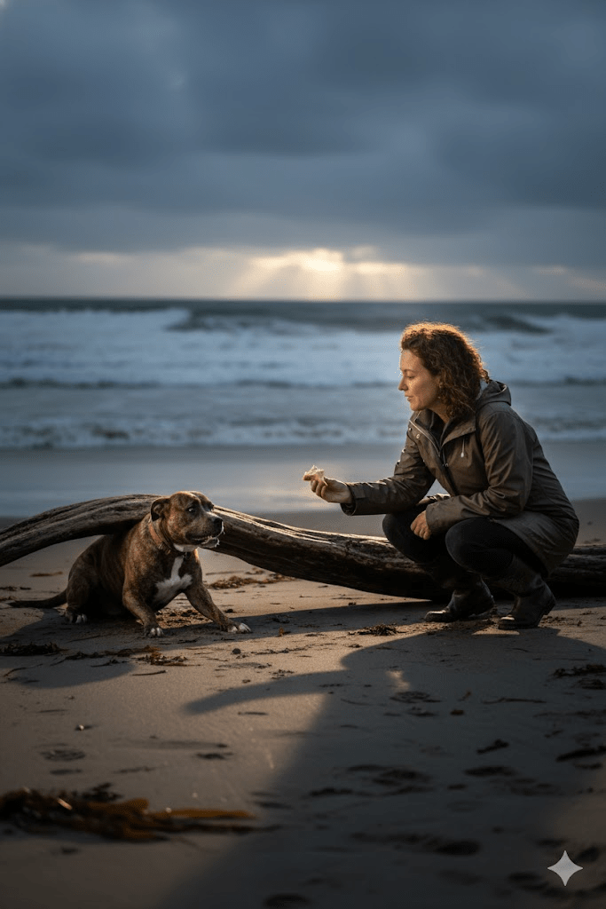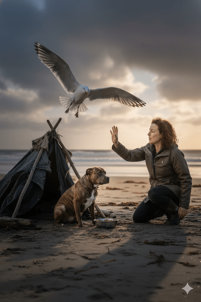 Sarah tried to take Sandy home, but the dog, still wary, bolted. For days, Sarah returned to the beach, leaving food and water, patiently waiting. She even set up a makeshift shelter for Sandy. Slowly, cautiously, Sandy began to trust her. The turning point came when a mischievous seagull tried to snatch Sandy’s food, and Sarah instinctively shooed it away, protecting the vulnerable dog. In that moment, Sandy seemed to understand that Sarah was different.