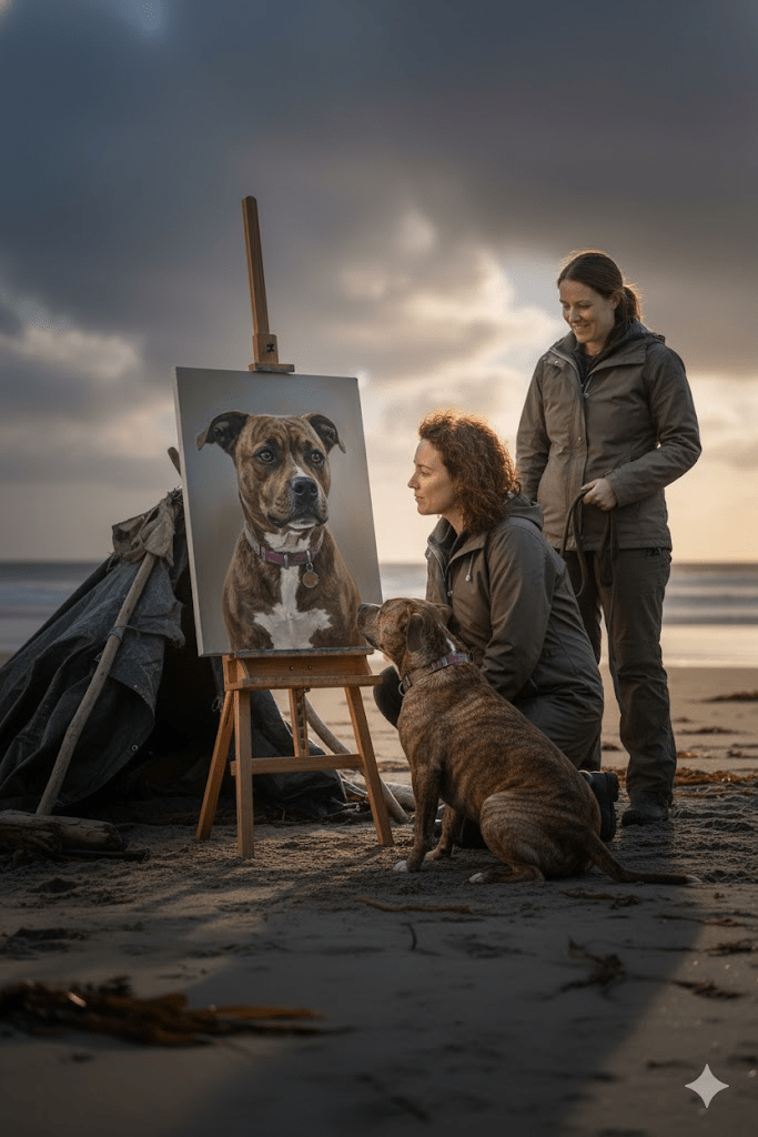 It wasn’t easy. Sandy, despite her growing trust, still carried the scars of her past. She would sometimes nip when startled or shy away from sudden movements. Sarah, however, remained steadfast, seeking advice from local dog trainers and pouring endless patience into Sandy’s rehabilitation. She even painted Sandy’s portrait, capturing her soulful eyes and resilient spirit, hoping to find her a loving home.