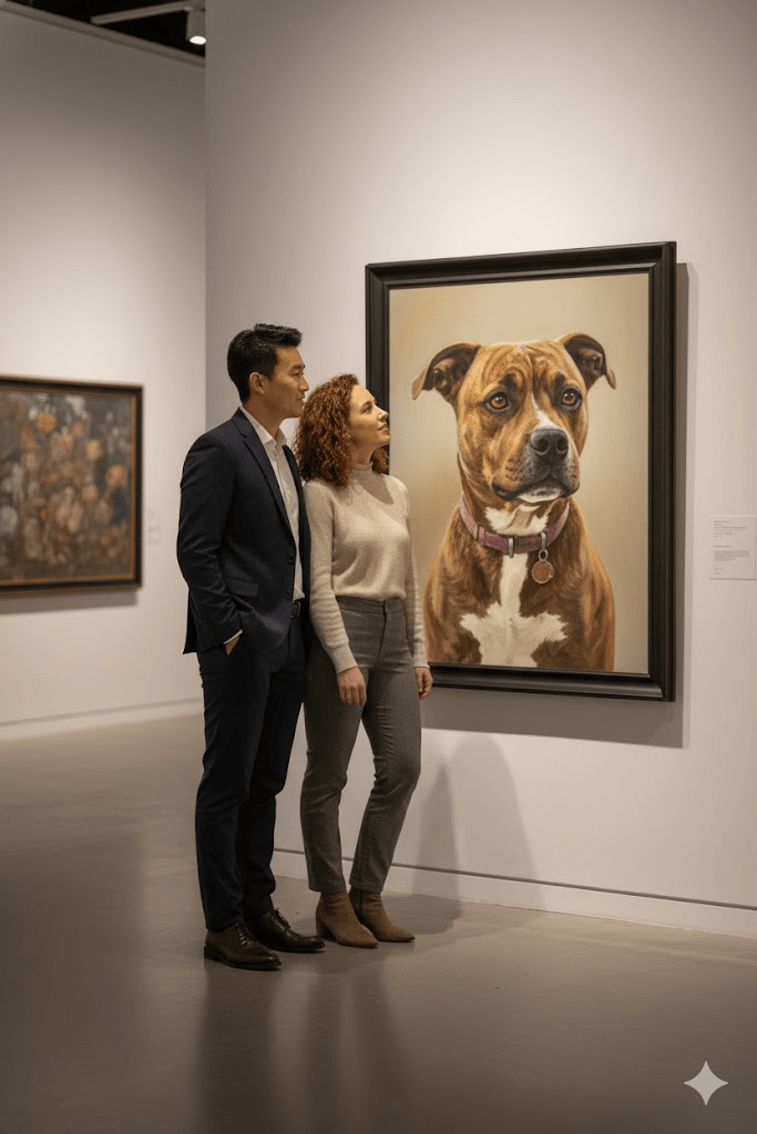 Unexpectedly, a young couple, avid art collectors, saw Sarah’s painting of Sandy at a local gallery exhibit. They were immediately captivated by the dog’s expression and the story behind the artwork. They had been looking to adopt a dog for months, and something about Sandy’s vulnerability and strength resonated deeply with them.