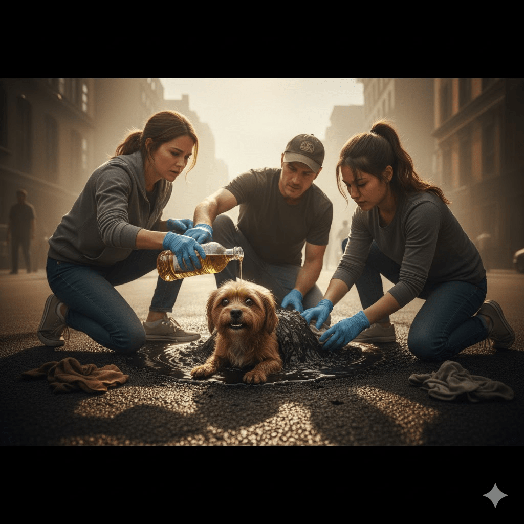 Anna quickly realized the enormity of the task. The asphalt had hardened around the dog, encasing him like a macabre sculpture. Time was of the essence; the longer he remained trapped, the more severe his injuries would become, and the greater the risk of heatstroke and suffocation. Her first instinct was to pull, but the tar’s grip was unyielding, threatening to tear his delicate skin. A local shopkeeper, witnessing her struggle, offered a bottle of cooking oil – a seemingly simple suggestion that would prove to be a crucial turning point. Applying the oil liberally, Anna, joined by a few others who finally stopped to help, began the painstaking process of gently massaging the hardened tar, slowly, inch by agonizing inch, trying to loosen its deadly hold. The sun dipped below the horizon, casting long shadows, but their determination never wavered. The dog, initially frantic, seemed to sense their intentions, his whimpers subsiding into soft moans as he endured the slow, uncomfortable process. What began as a solo mission had, against all odds, drawn in a small, impromptu team united by a shared purpose. `