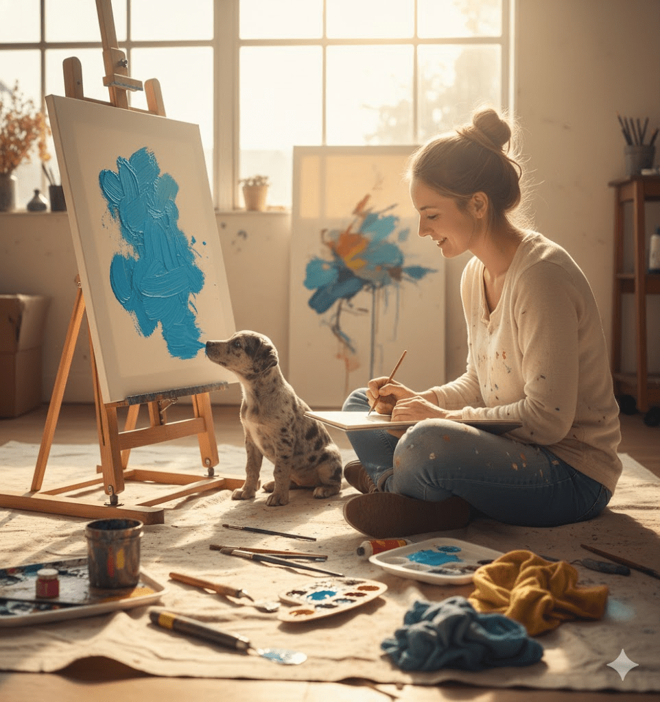Faced with dwindling space and mounting medical costs, Pip’s shelter had to make difficult decisions. A small group of long-term residents, including Pip, were selected for a temporary foster program with local volunteers. It was during this period that Pip met Sarah, a kind-hearted artist with a quiet home and a knack for understanding anxious animals. Sarah introduced Pip to the world outside the shelter, slowly exposing him to new sights and sounds. She discovered his unexpected fascination with her art supplies, particularly the vibrant tubes of paint. One afternoon, while Sarah was sketching, Pip nudged a discarded paintbrush with his nose, leaving a delicate, abstract smear of blue on the canvas.