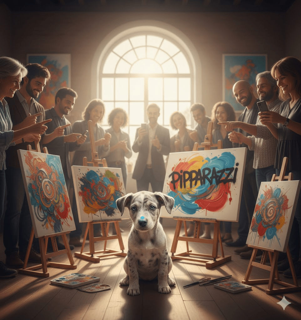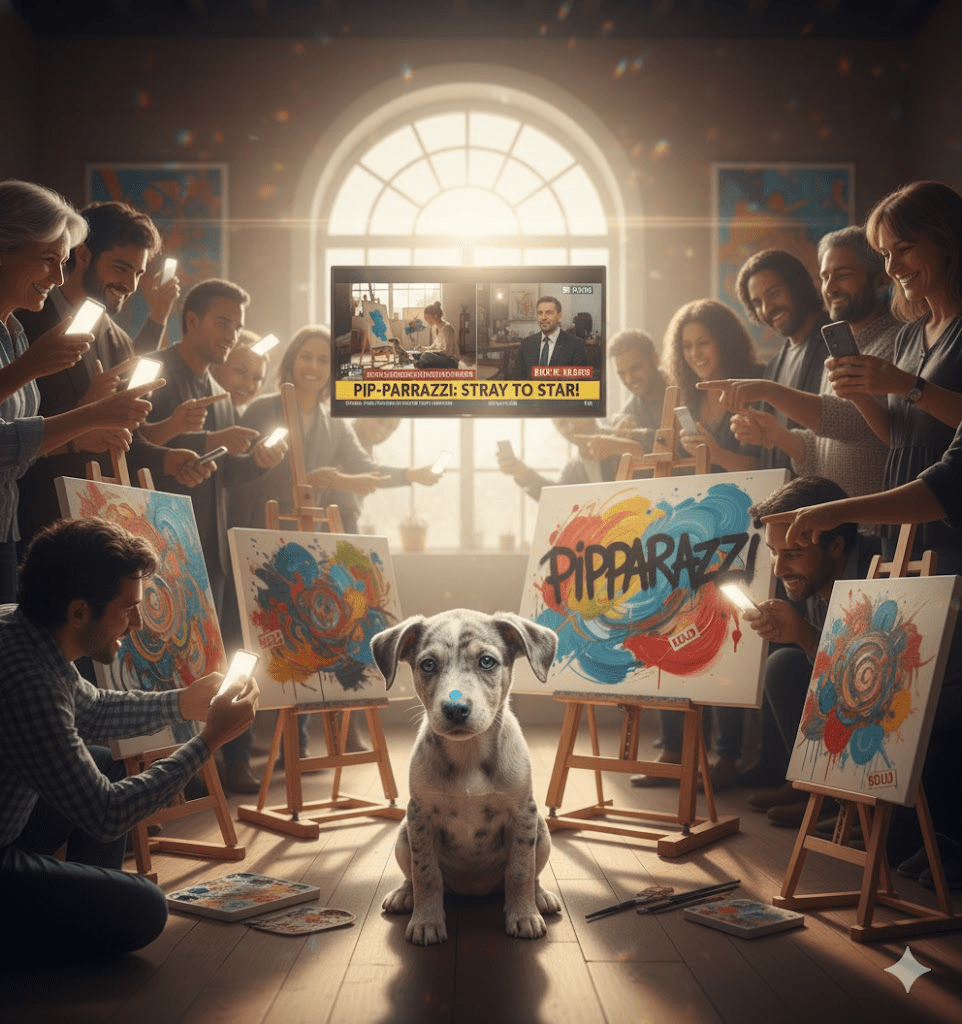 A gallery owner, intrigued by the buzz and the genuine charm of Pip’s story, contacted Sarah. They proposed a charity art exhibition featuring Pip’s work, with all proceeds benefiting animal shelters. The “Pip-parazzi” exhibition was an unprecedented success. Art collectors, animal lovers, and curious onlookers flocked to see the canine prodigy’s masterpieces. Pip, now a confident and affectionate dog, made special appearances, charming everyone with his gentle demeanor. The media, of course, couldn’t get enough of this feel-good story.