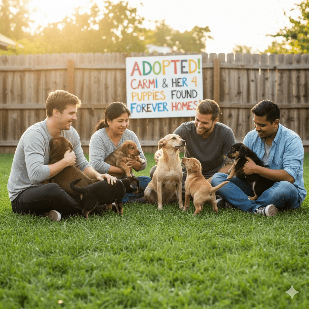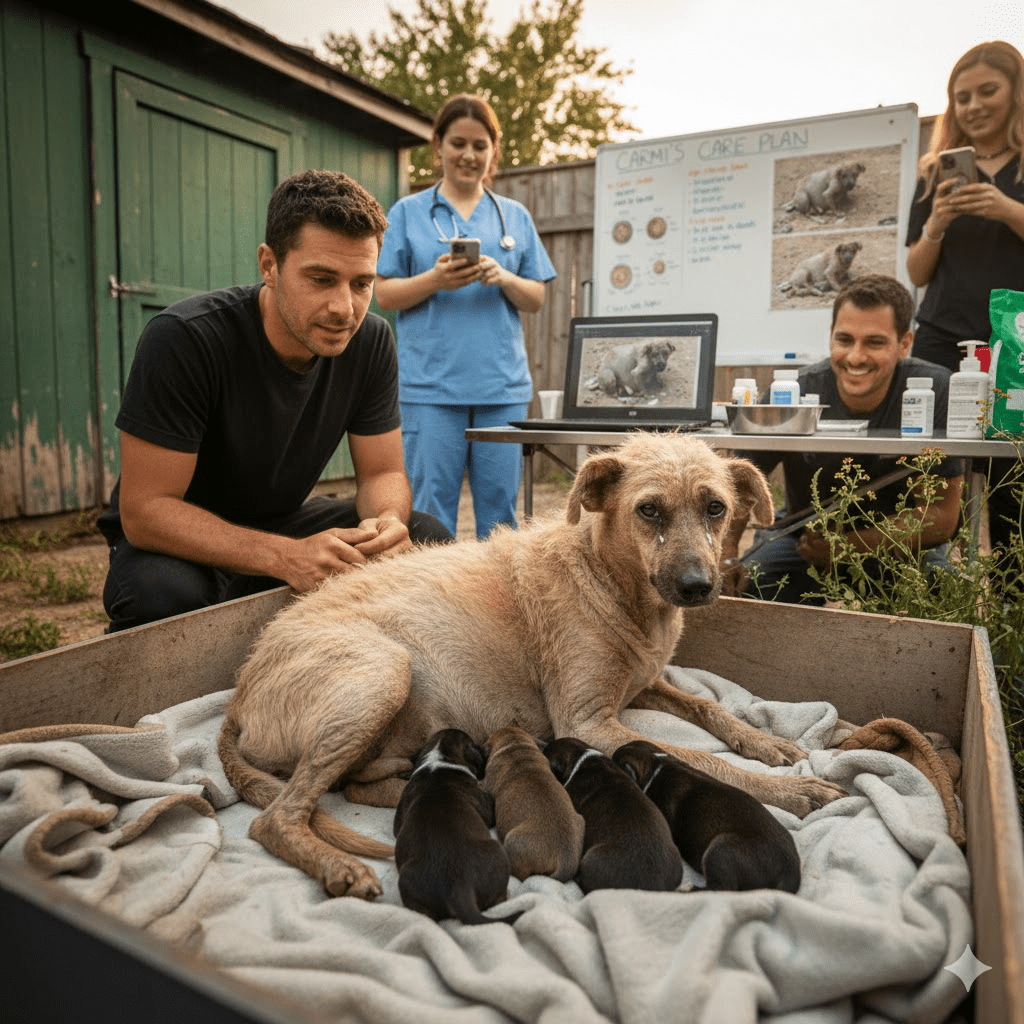 The initial days were a battle against despair. Carmi was resistant, flinching at every touch, her past traumas deeply ingrained. The kind stranger, who would later be known as David, spent hours simply sitting near her, speaking in soft, reassuring tones, offering small portions of food and water that she initially refused. The biggest challenge was her advanced pregnancy; veterinarians warned that stress could jeopardize both Carmi and her unborn pups. A makeshift shelter was constructed, offering a semblance of security, but Carmi remained wary. Just as David began to question if his efforts were in vain, a tiny whimper broke the silence. To his shock, not one, but four tiny puppies had arrived overnight, delivered in secret, nestled close to their exhausted mother. This unexpected twist, Carmi choosing to trust him just enough to bring her precious cargo into the world under his care, spurred him on with renewed determination.