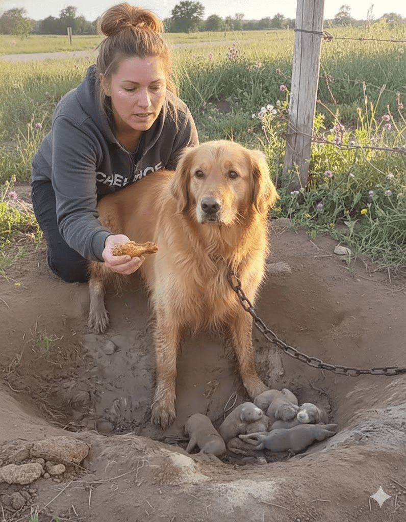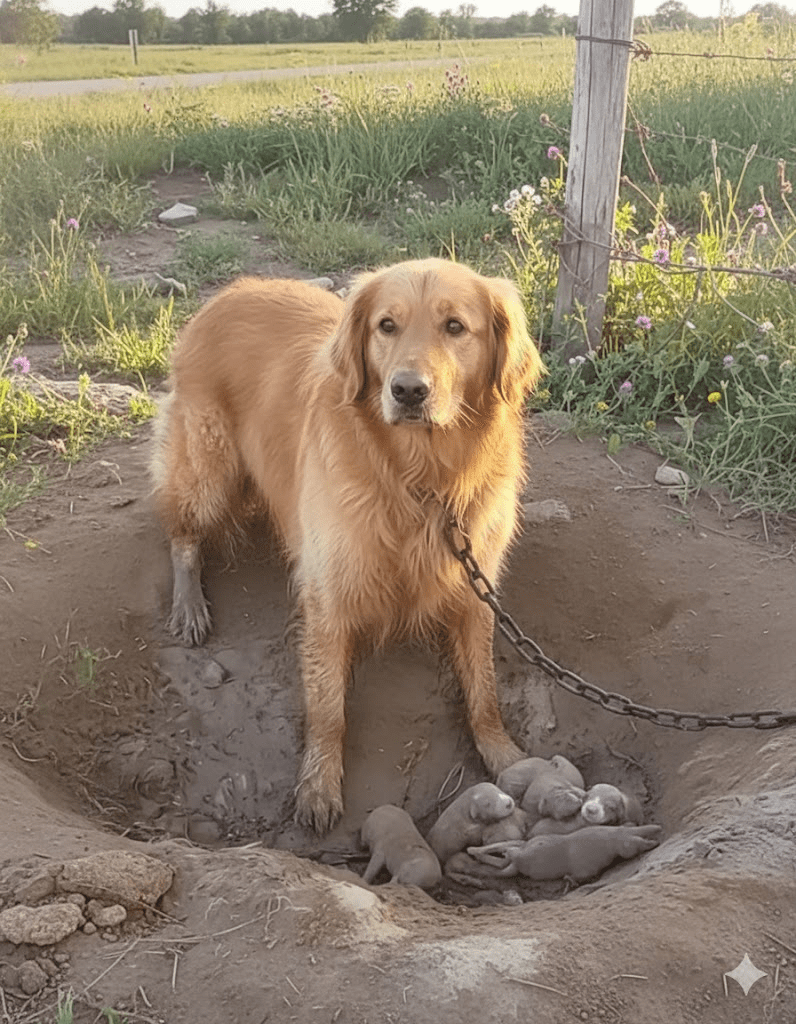 As dawn broke, painting the sky with hues of orange and pink, Sarah pulled her rugged SUV off the main road, the GPS leading her down a winding dirt track. The silence of the countryside was broken only by the crunch of gravel under her tires. Her heart pounded as the coordinates narrowed, revealing a dilapidated farmstead in the distance. A shiver ran down her spine – the isolation of the place amplified the cruelty of the situation. As she drew closer, the scene unfolded before her, even more heartbreaking than the photo had suggested. There, amidst a patch of thorny weeds and dry, cracked earth, was the golden retriever, her fur clotted with mud, her eyes scanning the horizon with a mix of fear and desperate hope. Beside her, nestled in a shallow, muddy hollow, were five tiny, squirming puppies, no more than hours old. The mother dog was still chained, the heavy metal biting into her neck, tethering her to a weathered wooden post. It was a stark tableau of new life born into unimaginable hardship.