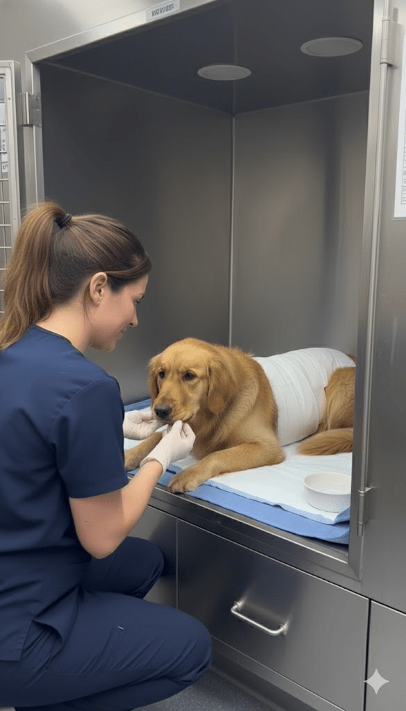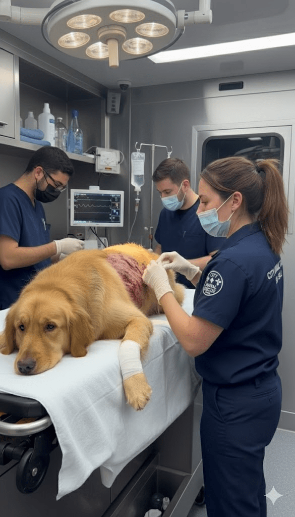 The initial days were a perilous dance between hope and despair. Sunny developed a high fever, a common complication of such widespread infection, and his appetite remained minimal. The staff took turns hand-feeding him small, nutrient-rich meals, gently coaxing him to eat. One evening, a particularly alarming turn occurred when Sunny experienced a sudden respiratory distress. The emergency team was called in, and for what felt like an eternity, the fate of the golden retriever hung by a thread. Dr. Thorne, working tirelessly, discovered a previously undetected foreign object lodged deep in Sunny’s airway, likely from scavenging. A swift, delicate procedure was performed, and against all odds, Sunny stabilized. This unexpected twist, a testament to the unforeseen challenges in rescue work, deepened the bond between Sunny and his caregivers.
