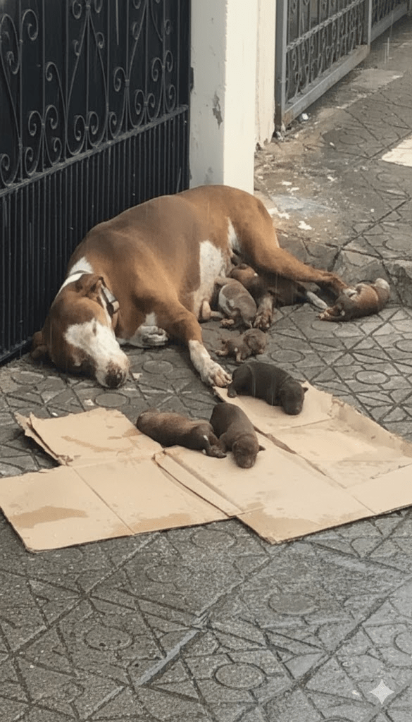 The persistent drizzle mirrored the despair in her eyes as she lay huddled against the cold, unforgiving fence. Each drop that landed on her matted fur seemed to carry the weight of her abandonment, a stark reminder of the harsh world she now inhabited. This wasn’t the warm, soft bed she once knew, nor the gentle caress of a loving hand. This was the street, a cruel cradle for the miracle unfolding beneath her weary body.
