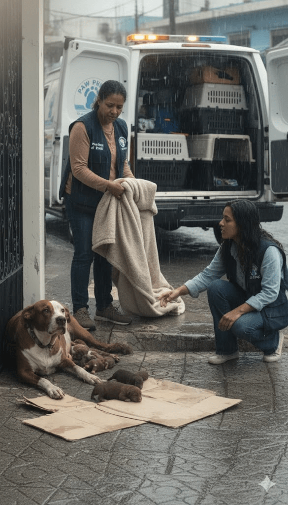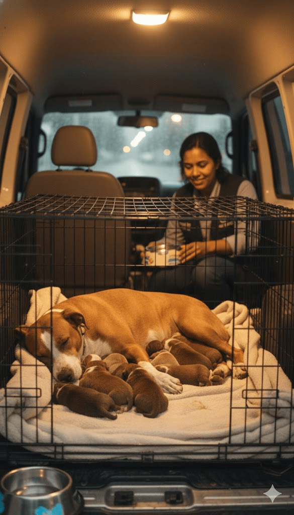 The initial rescue was a delicate dance of trust and cautious movement. Hope was too weak to resist much, but her eyes never left her puppies as Elena carefully scooped them into a separate, warm carrier. Maya, meanwhile, continued to speak softly to Hope, offering reassurance. Once her puppies were safely inside the van, Hope seemed to relax, allowing Elena to gently lift her. Wrapped in a soft blanket, she was finally off the cold, wet pavement, her body trembling not just from cold, but from relief. It was a small victory, but a significant one – the first step towards a new life.