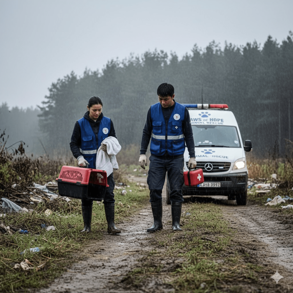With the puppy gently cradled in his arms, Mr. Tan rushed to his car, making an urgent call to “Paws of Hope,” a local animal rescue organization. The rescue team, already on another critical mission miles away, immediately diverted their route. Their journey to the remote ditch was a race against time, complicated by a sudden downpour that turned the already muddy tracks into treacherous rivers. The thought of the puppy’s fading life fueled their determination, pushing them through the worsening weather conditions.