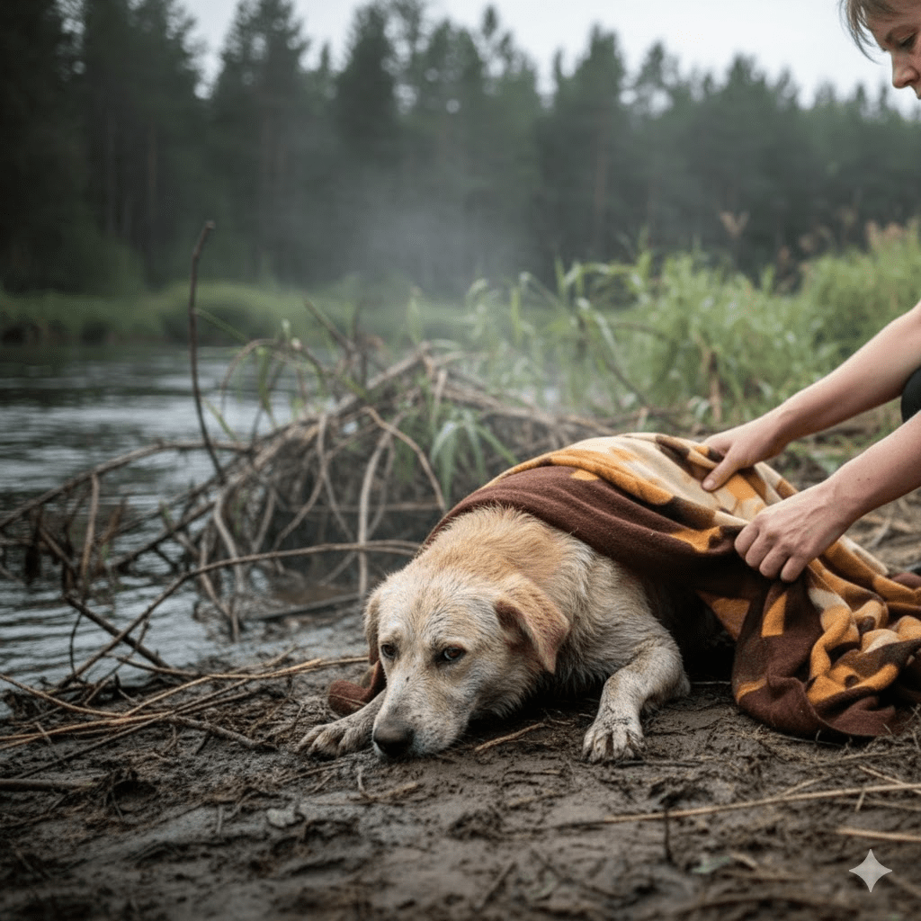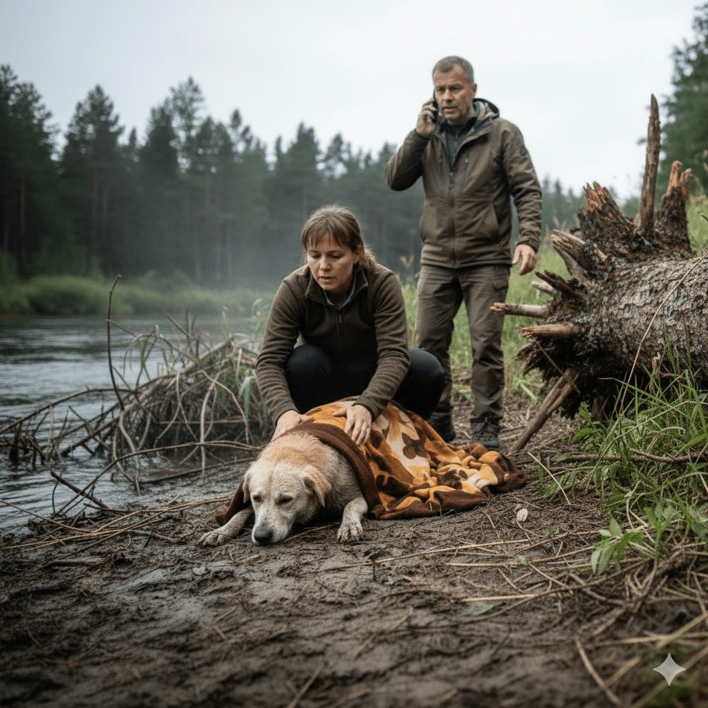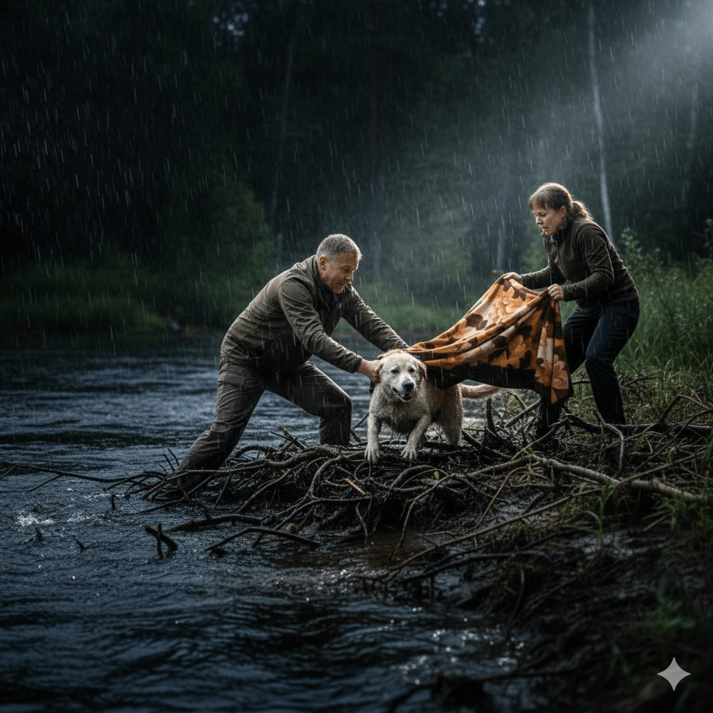The rescue itself was not without its own set of challenges. As David arrived, a sudden downpour began, turning the already muddy riverbank into a treacherous quagmire. Working quickly, the siblings fashioned a makeshift stretcher from some sturdy branches and the very blanket that had sheltered Broddick. The dog, though weak, seemed to understand their intentions, offering minimal resistance as they carefully lifted him. The journey back to their vehicle was slow and arduous, each step a testament to their unwavering determination against the elements.