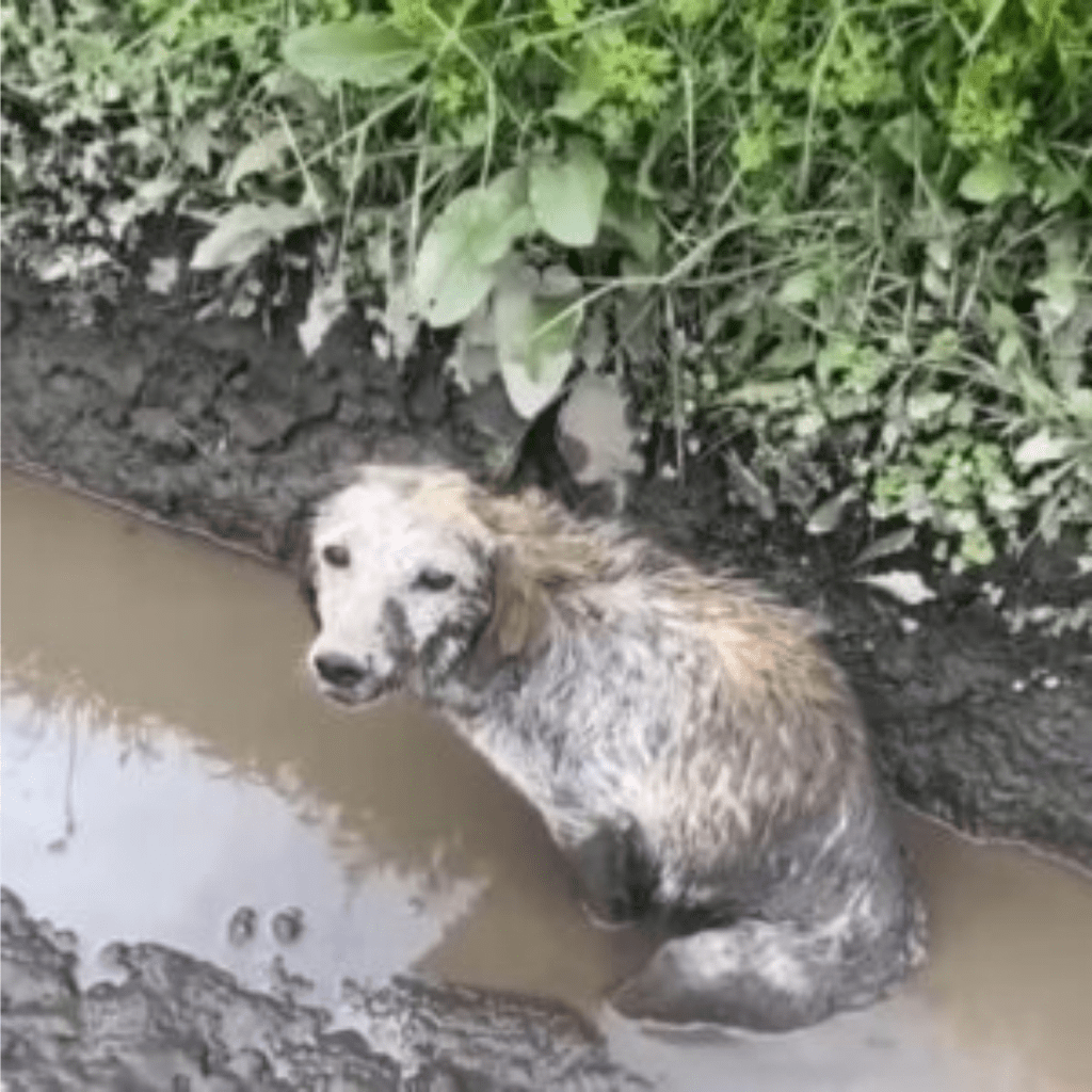 The silence of a dreary afternoon was shattered by the frantic barks of a dog, echoing from a forgotten drainage ditch on the outskirts of town. What began as a mundane stroll for a group of curious children quickly turned into a discovery that would galvanize an entire community. Peering into the murky depths, they spotted a pitiful sight: a medium-sized dog, caked in thick mud, struggling to stay afloat in the stagnant water. Its eyes, though dulled by exhaustion and fear, held a flicker of hope, a silent plea for salvation. This was no ordinary stray; its matted fur and emaciated frame told a story of hardship and abandonment, a narrative that was about to take an unexpected turn towards resilience and redemption. The children, too young to fully comprehend the gravity of the situation but old enough to feel the pangs of empathy, knew they had to act, setting in motion a chain of events that would soon captivate the hearts of many.