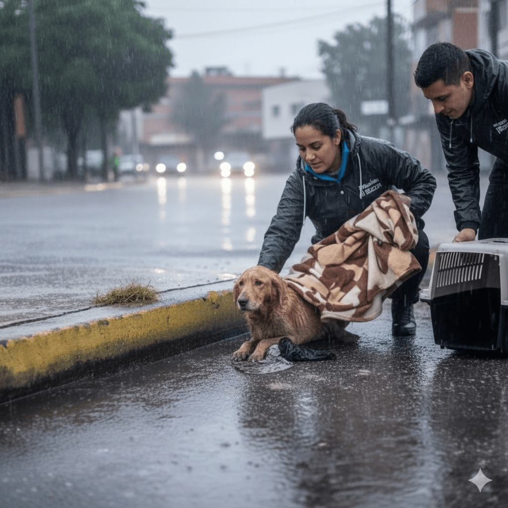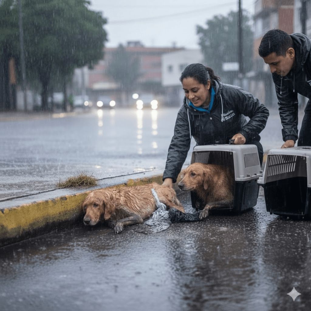 But then, a glimmer of hope appeared through the relentless rain. Two figures, members of the Fundación JR Rescata team, spotted her fragile form. They approached cautiously, their hearts heavy with the sight of such profound suffering. Expecting fear or aggression, they were met instead with a weak, almost imperceptible wag of her tail – a desperate flicker of trust in a world that had given her little reason for it. This unexpected gentle response solidified their resolve; they knew, at that moment, that Polly’s fight was not yet over.