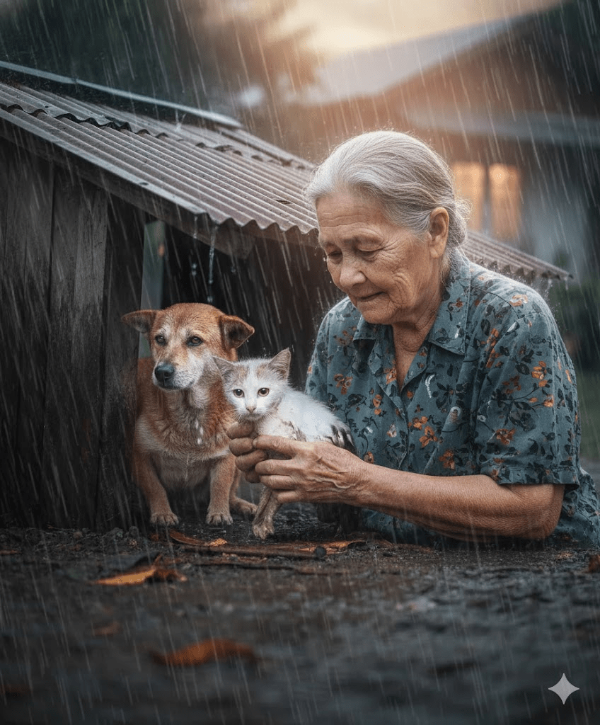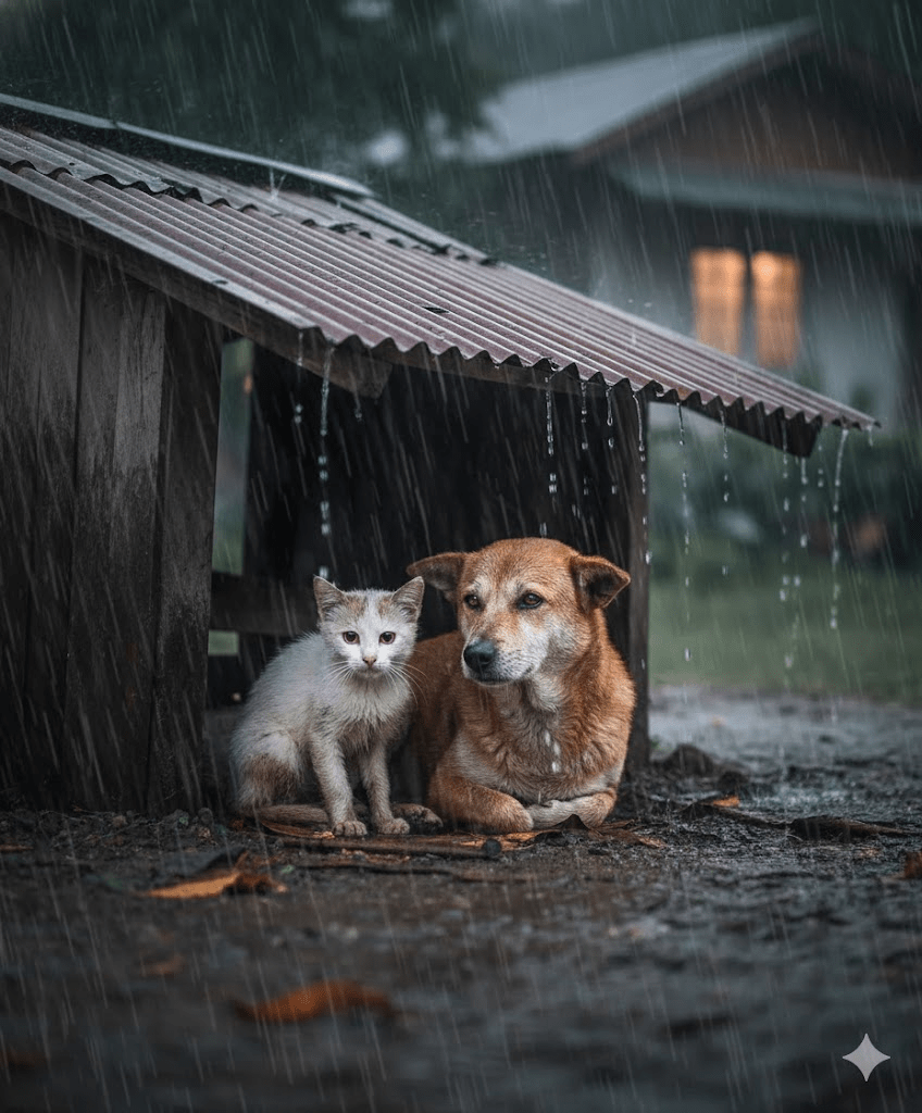 Her first stroke of luck came not from human hands, but from the sudden appearance of an old, three-legged stray dog named Rusty. Sensing her distress, Rusty approached cautiously, a low, comforting whine in his throat. He nudged her gently under a dilapidated shed, sharing the meager shelter from the relentless rain. It was an unlikely alliance—a mud-caked house cat and a grizzled street dog—but in that moment of shared vulnerability, a silent pact of survival was forged. They spent the rest of the night huddled together, two lost souls finding solace in each other’s unexpected presence.