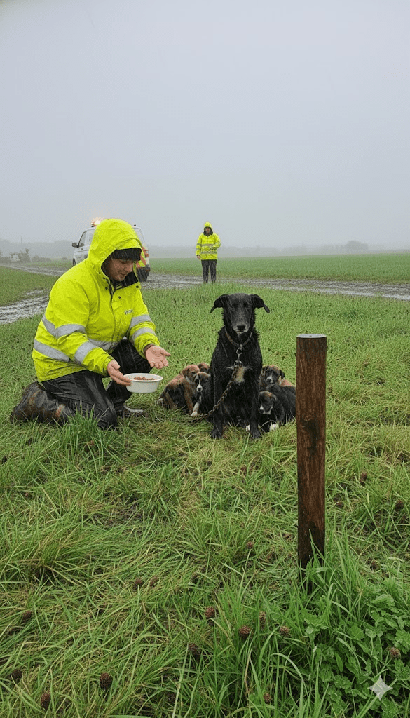 The relentless Irish rain hammered down, turning the remote field into a sea of mud. It was a bleak, unforgiving landscape, and yet, amidst the desolation, a flicker of life struggled to endure. Chained and abandoned, a courageous mother lurcher lay exposed to the elements, her body a shield for her six tiny, vulnerable puppies. Their whimpers were barely audible above the wind, a desperate plea in a world that seemed to have forgotten them.