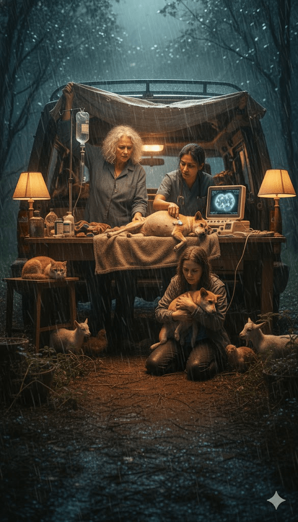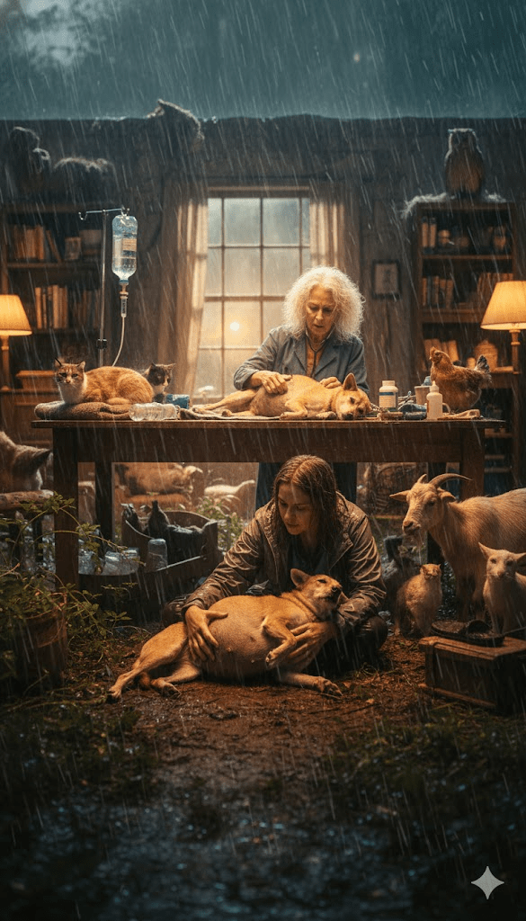 The first twist came when Clara realized the sheer impossibility of moving the dog alone. Desperate, she called her neighbor, Dr. Aris Thorne, a reclusive but brilliant retired veterinarian known for his unorthodox methods and deep love for animals. Dr. Thorne, usually reluctant to leave his isolated home, didn’t hesitate. He arrived with his old, beat-up pickup truck, packed with an array of medical supplies that looked like they belonged in a mobile field hospital. Under the relentless downpour, they carefully managed to lift the dog onto a makeshift stretcher and into the back of his truck. The rain, however, only intensified, making the drive back to his home a treacherous crawl.